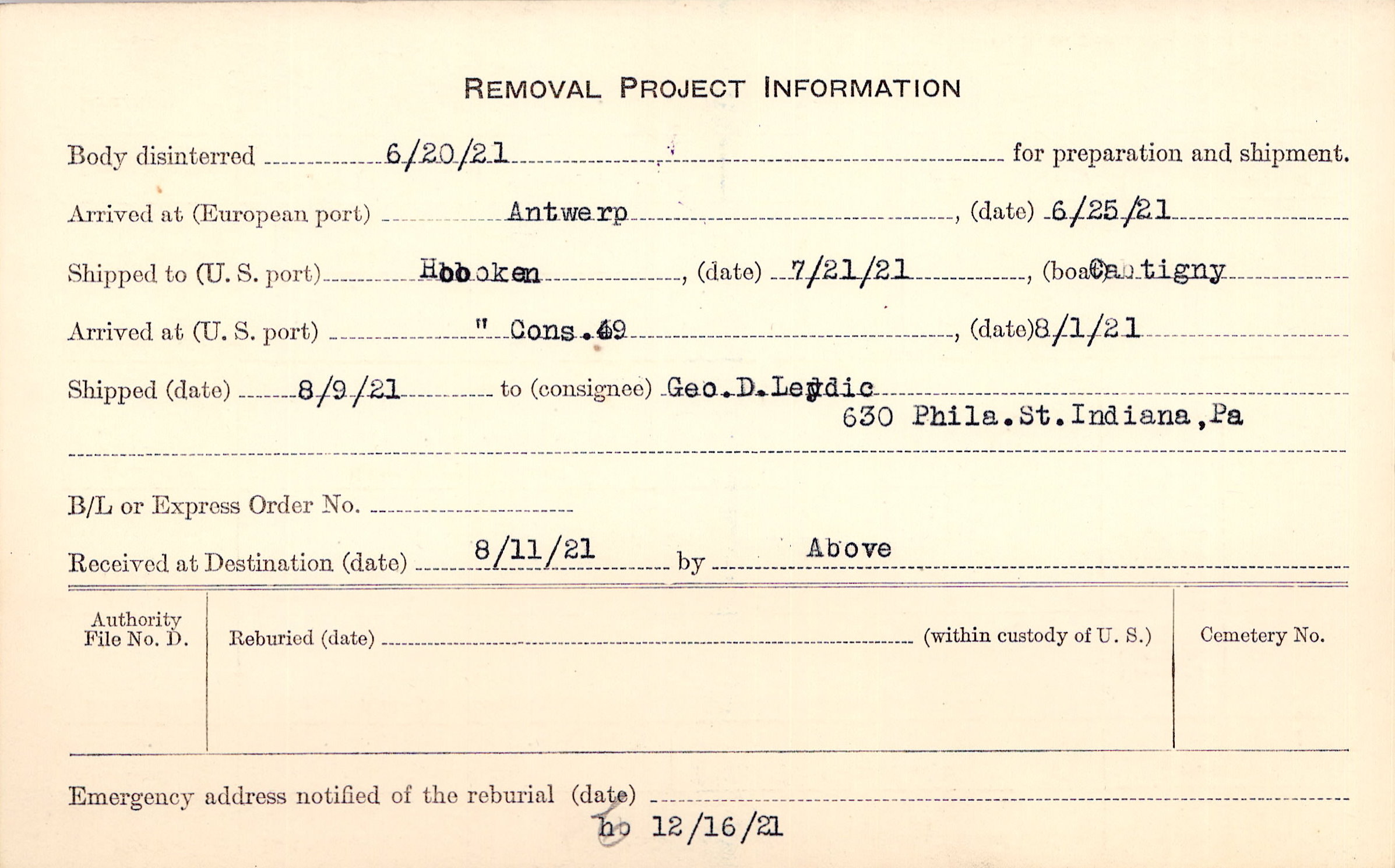Body disinterred 6/20/1921 for preparation and shipment.