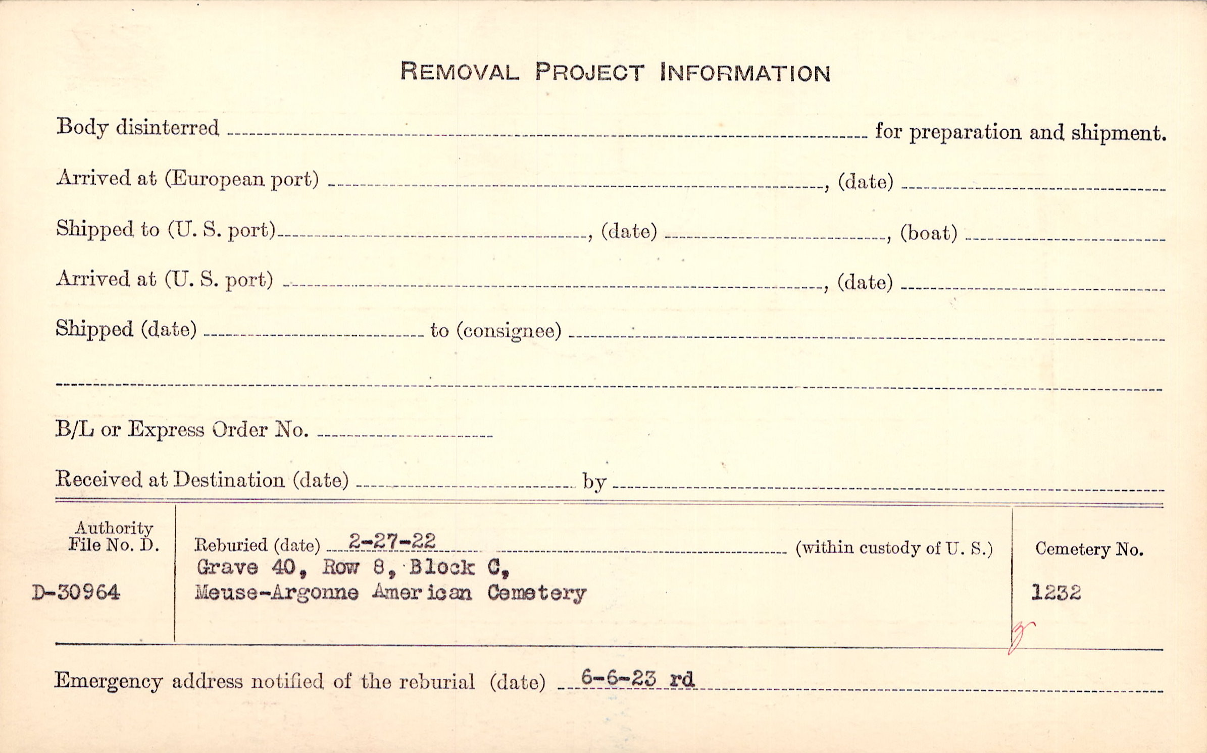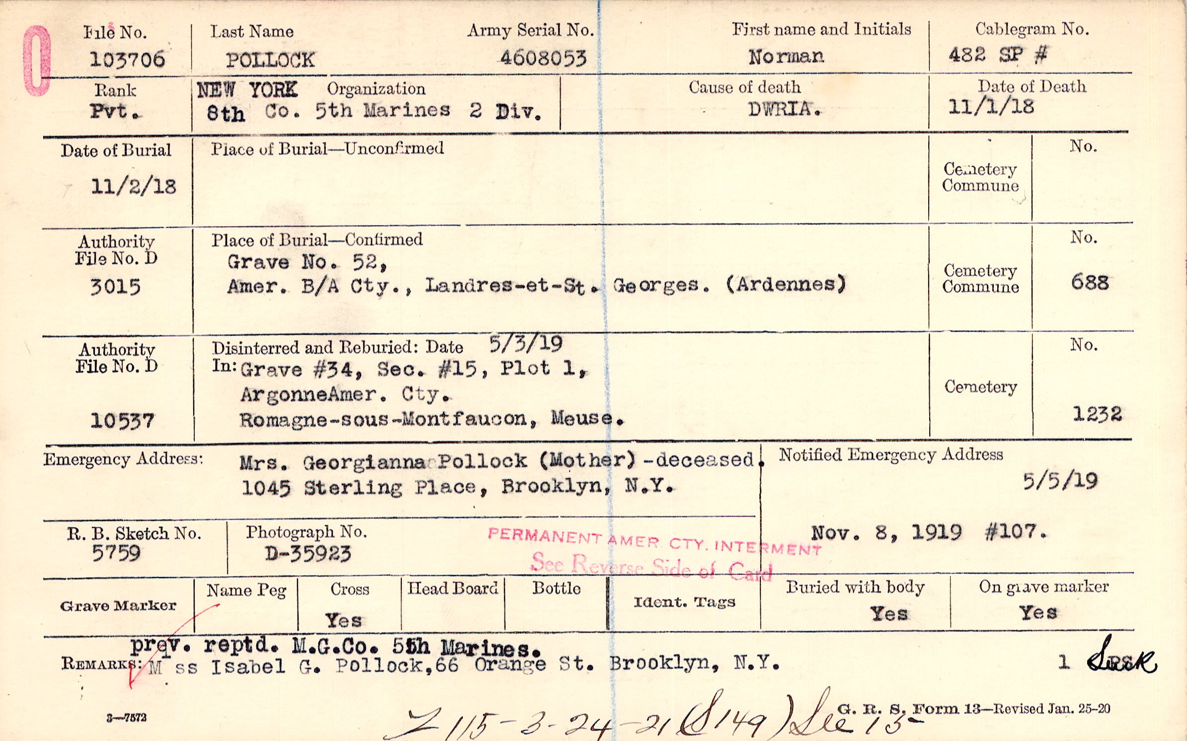 prev. reptd. M.G.Co. 5th Marines. Miss Isabel G. Pollock, 66 Orange St., Brooklyn, N.Y., F115-3-24-21 (S149), Sec 15