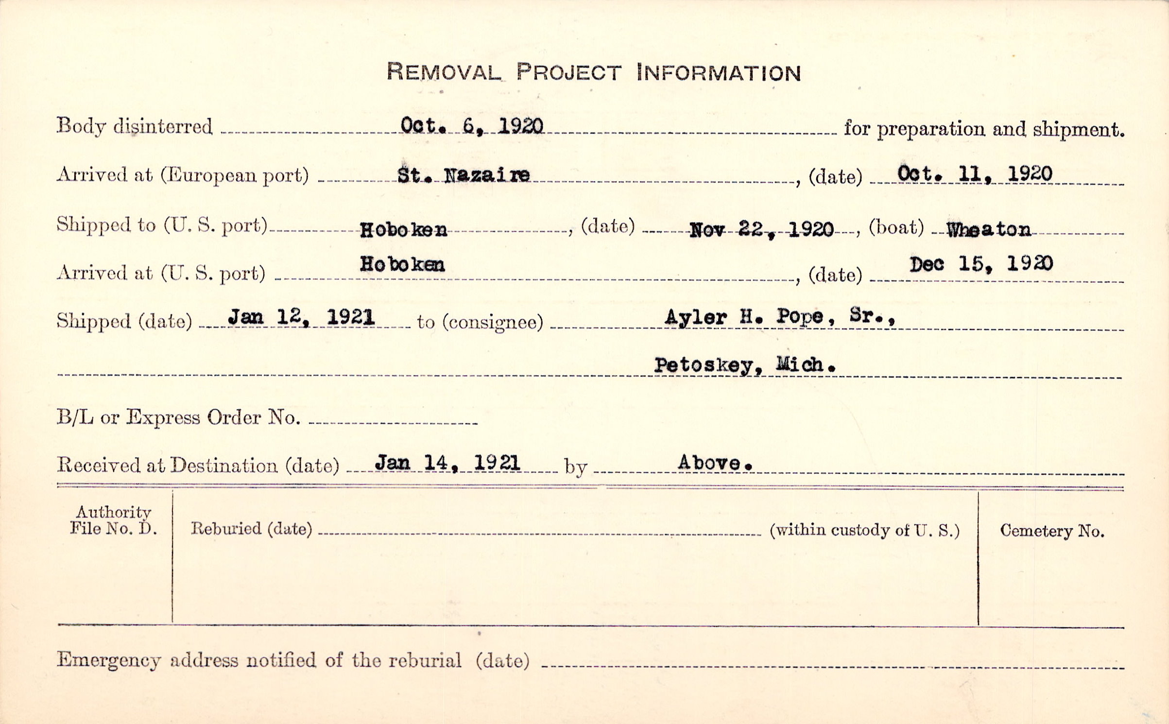 Body disinterred 10/6/1920 for preparation and shipment.