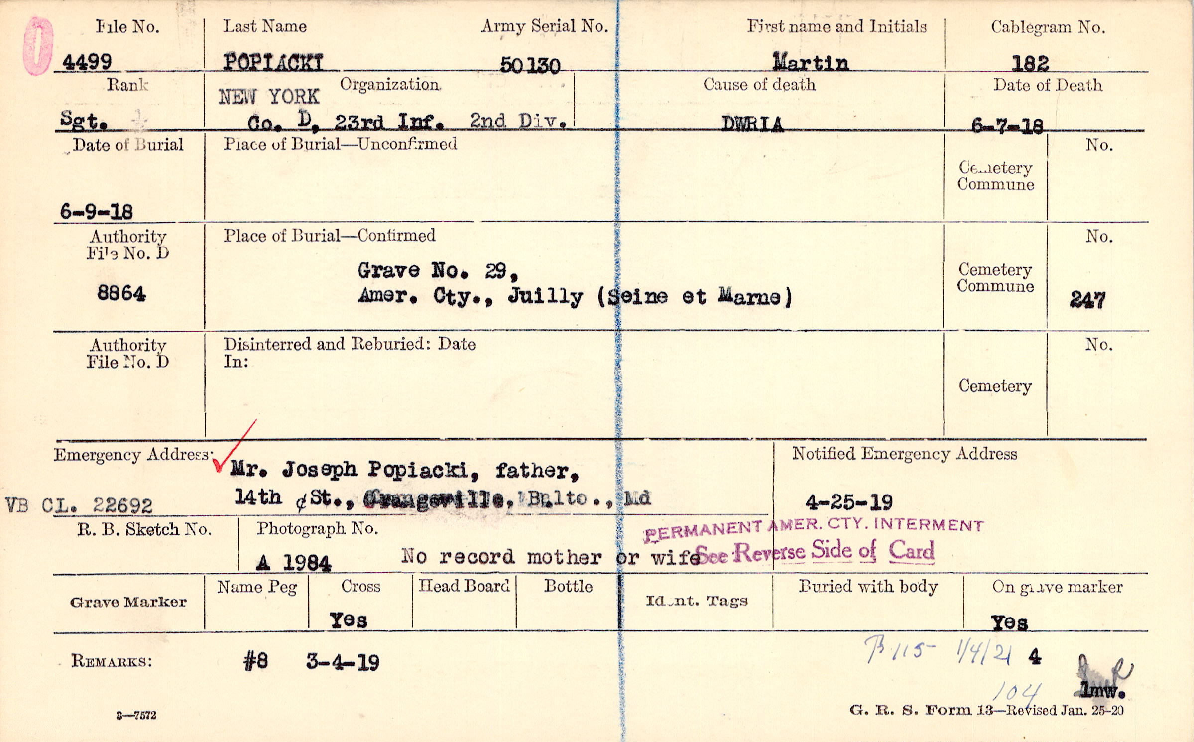 Mr. Joseph Popiacki (Father), 14th St., Orangeville Balto., Md., VB CL. 22692 No record mother or wife