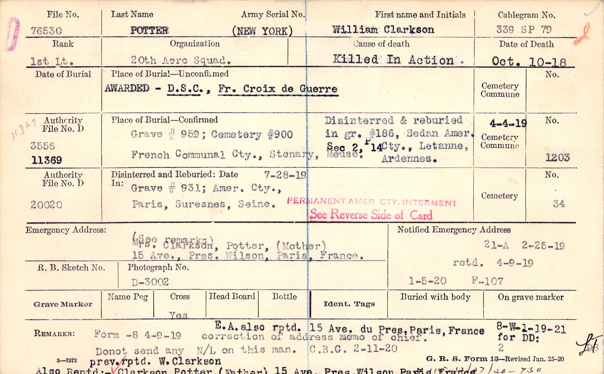Mrs. Clarkson, Potter, (Mother), 15 Ave., Pres. Wilson, Paris, France., (See remarks)