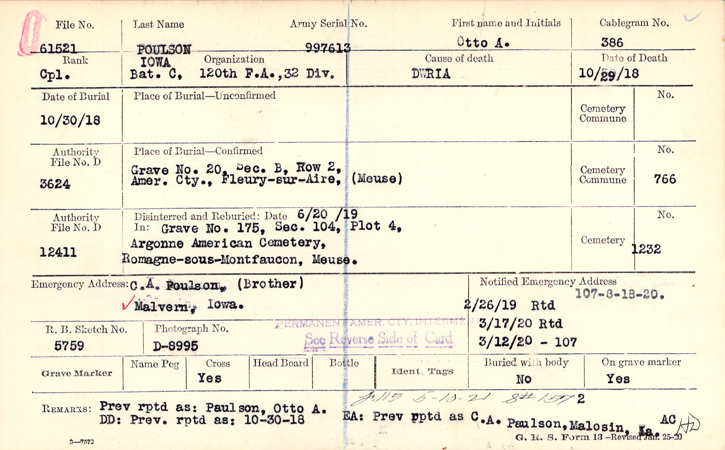 Prev rptd as: Paulson, Otto A. DD: Prev. rptd as: 10-30-18 EA: Prev rptd as C.A. Paulson, Malosin, Ia., 8# 157, F115 5-10-21 S#157. Prev rptd as: Paulson, Otto A. EA; Prev rptd as C.A. Paulson, Malosin, Ia. DD: Prev. rptd as:10-30-18