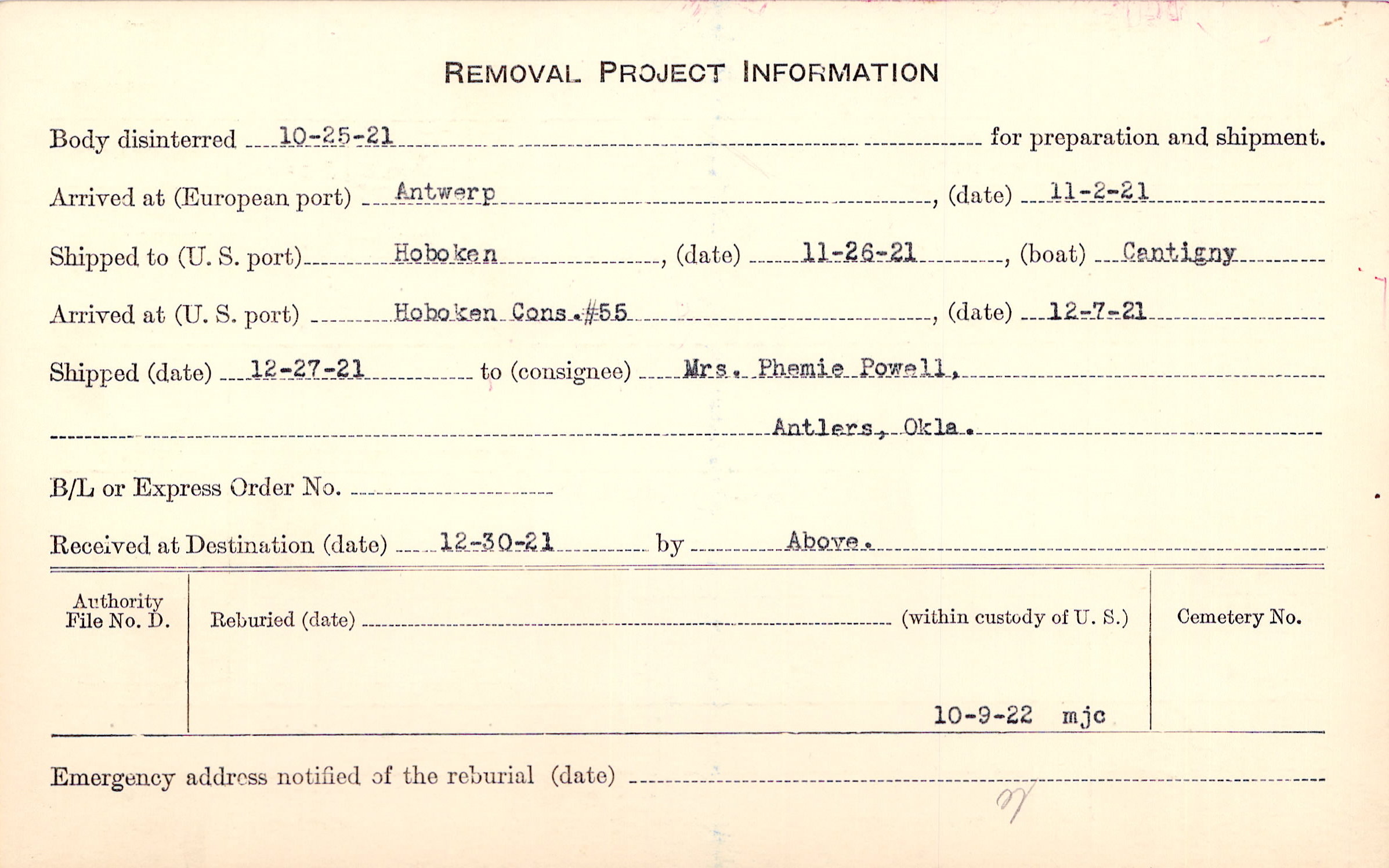 Body disinterred 10/25/1921 for preparation and shipment.