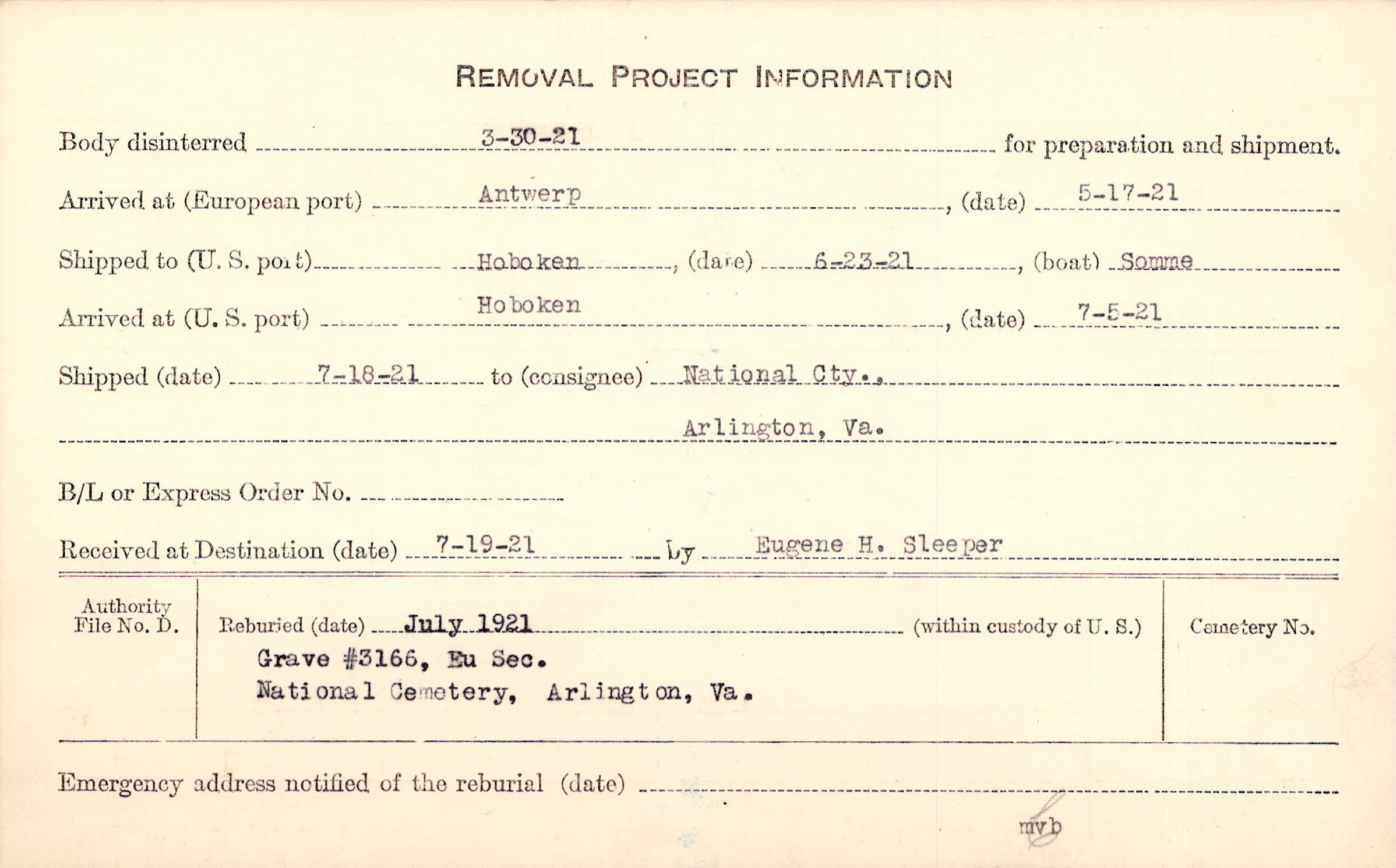 Body disinterred 3/30/1921 for preparation and shipment.