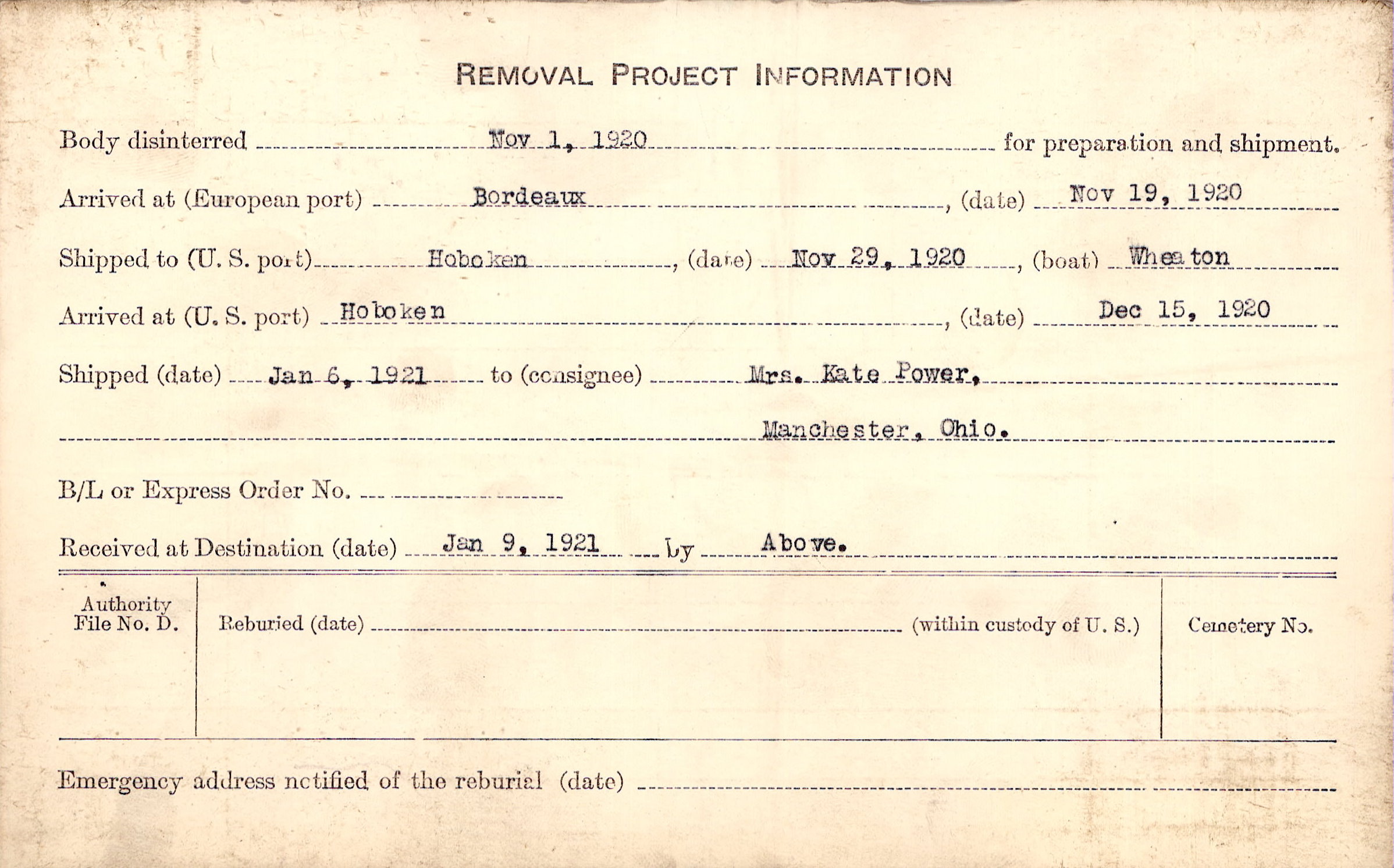 Body disinterred 11/1/1920 for preparation and shipment.