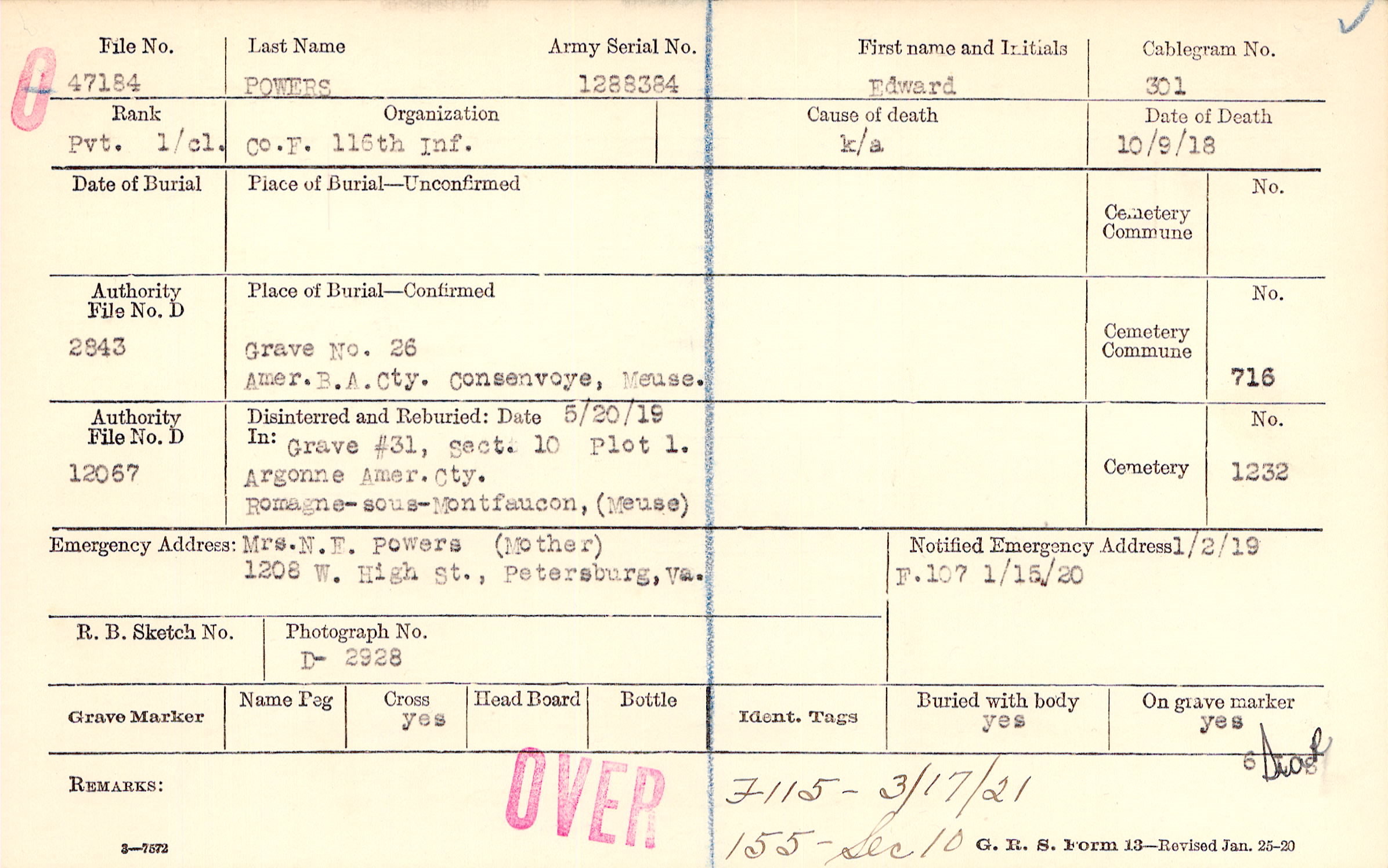 Grave 26, Amer. B/A Cty., Consenvoye, Meuse.
