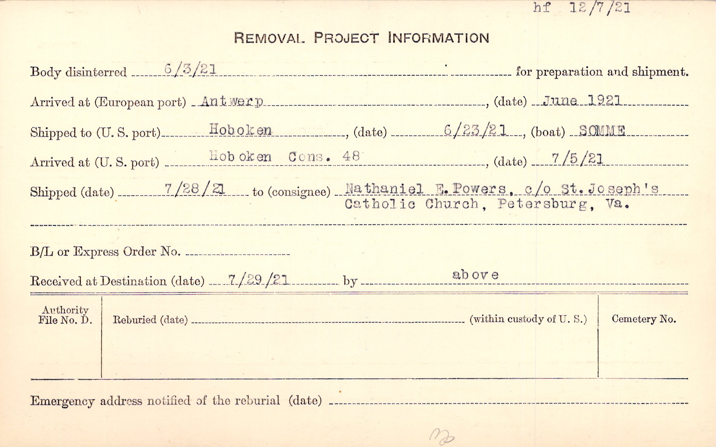 Body disinterred 6/3/1921 for preparation and shipment.
