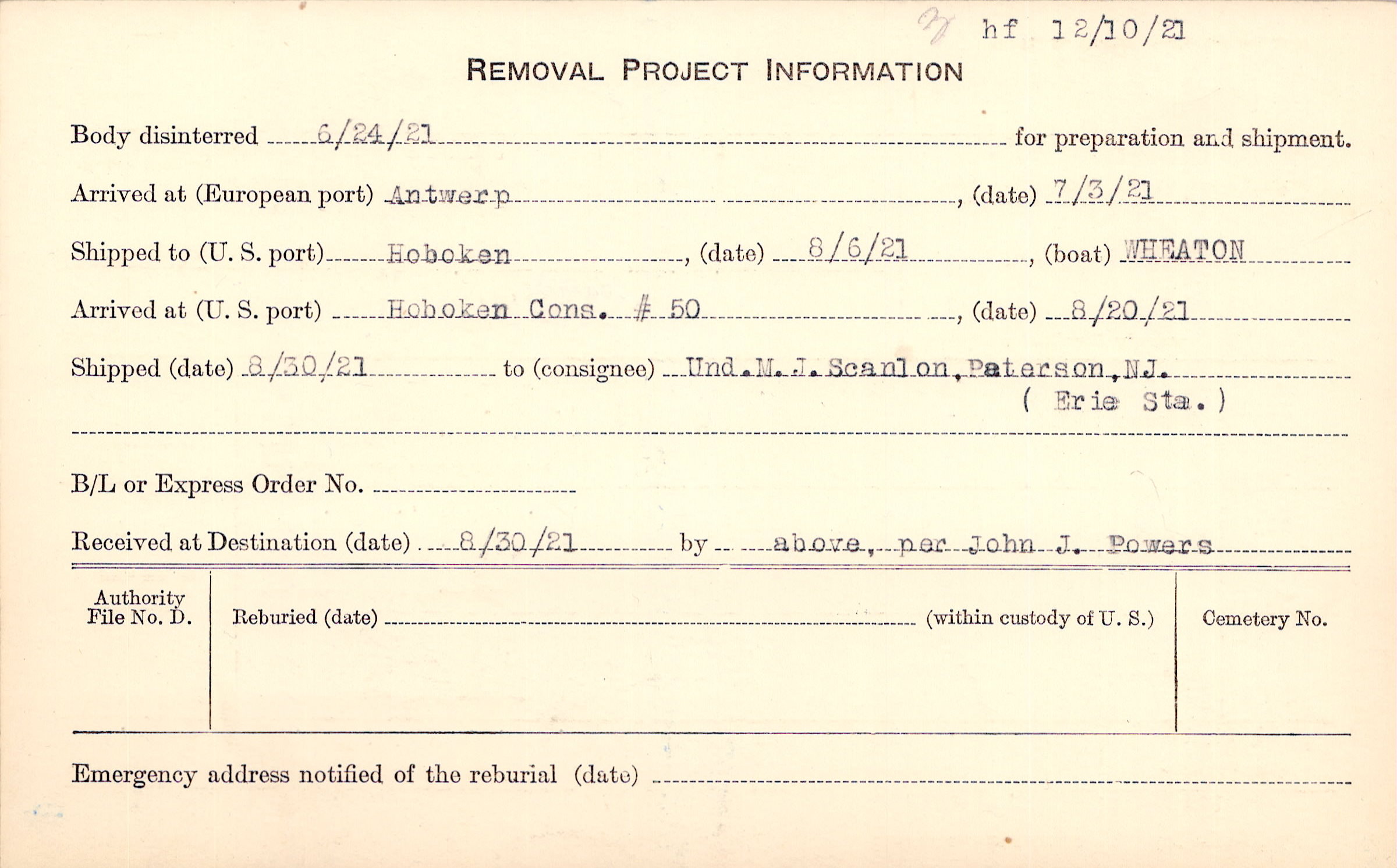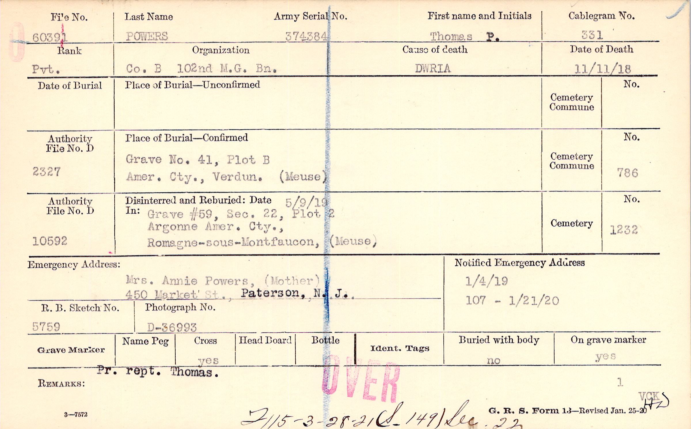 Mrs. Annie Powers, (Mother), 450 Market St., Paterson, N.J.