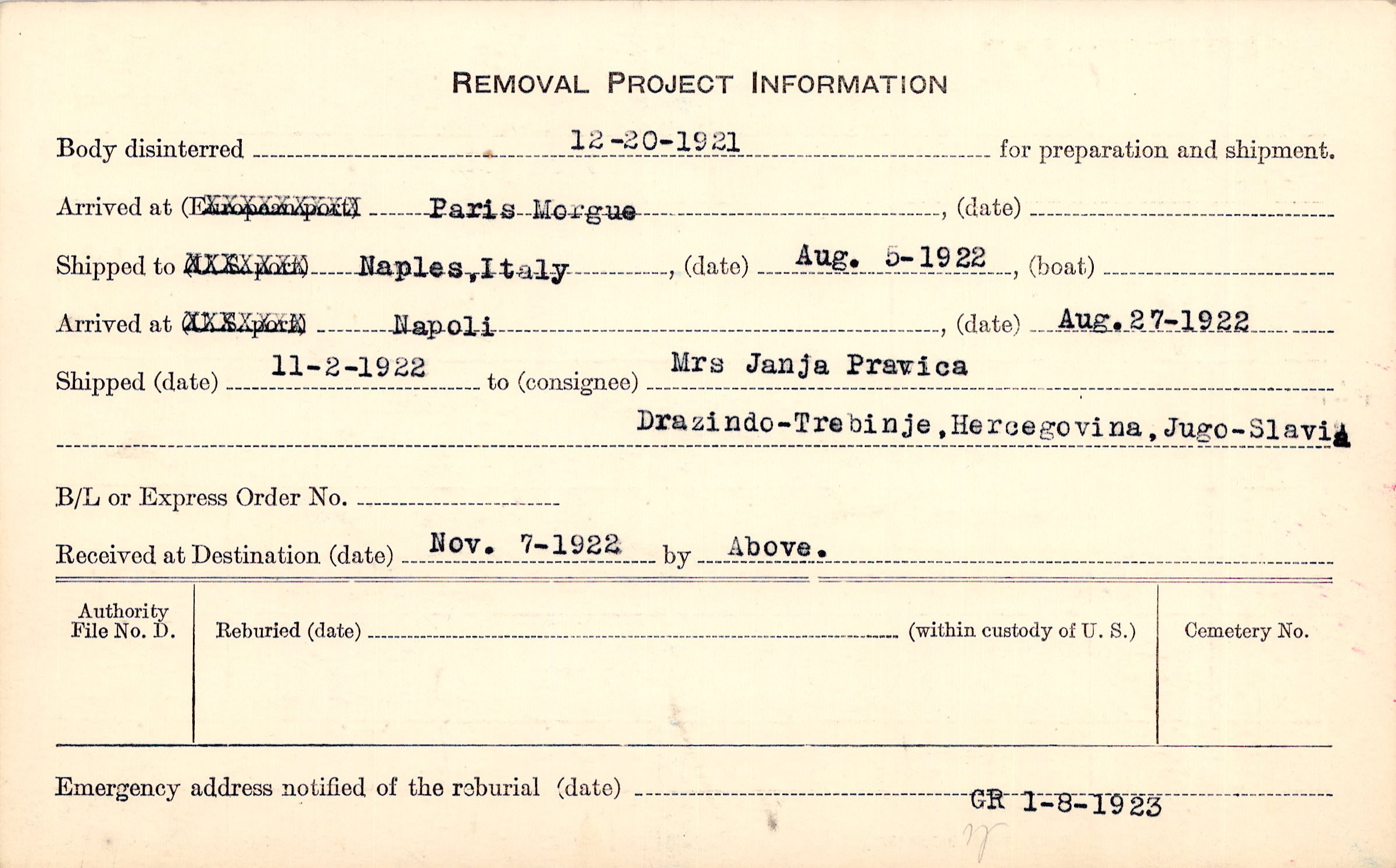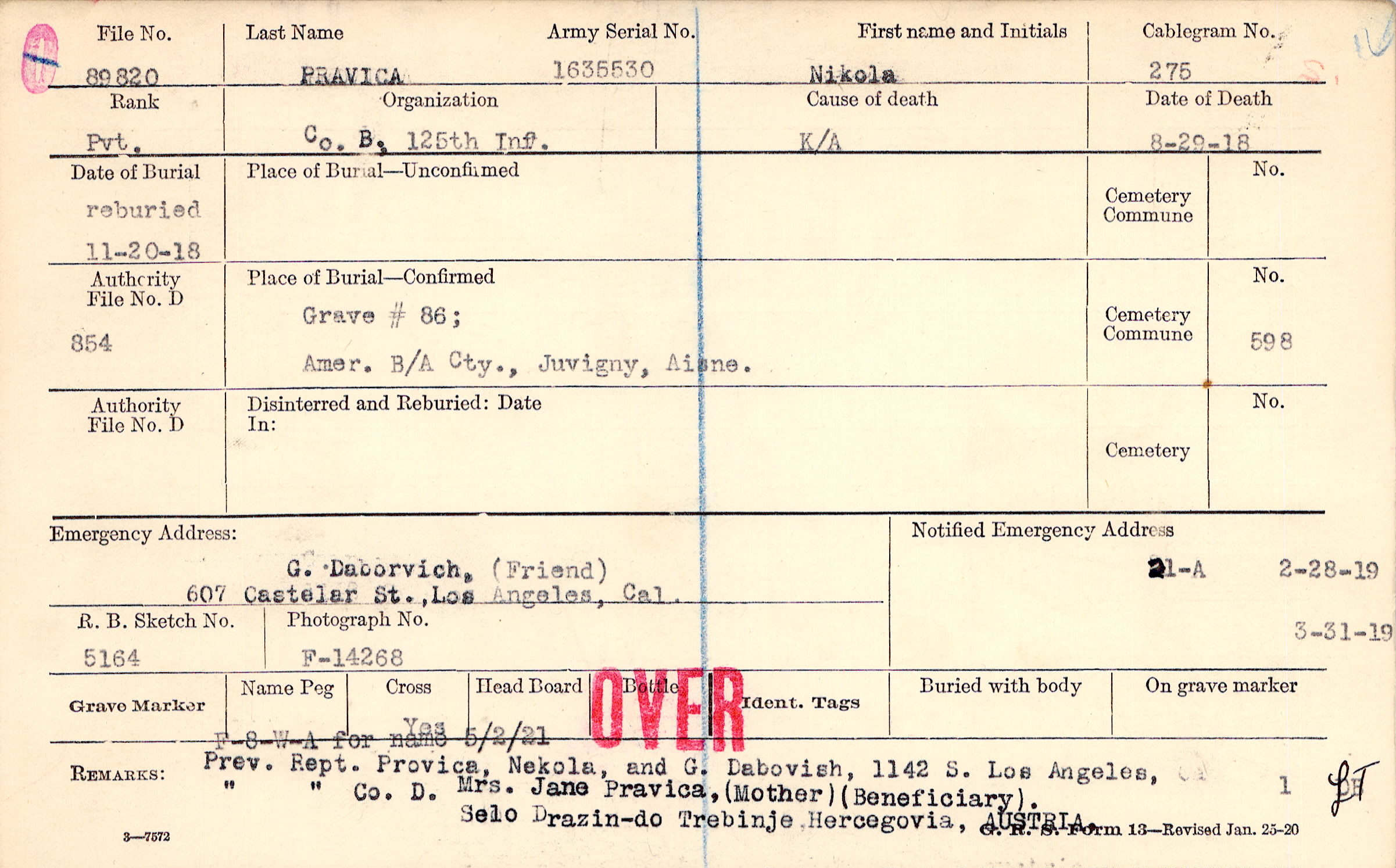 Prev. Rept. Provica, Nekola, and G. Dabovish, 1142 S. Los Angeles, Prev. Rept. Co. D. Mrs. Jane Pravica, (Mother) (Beneficiary). Selo Drazin-do Trebinje, Hercegovia, AUSTRIA., F-8-W-A for name 5/2/21