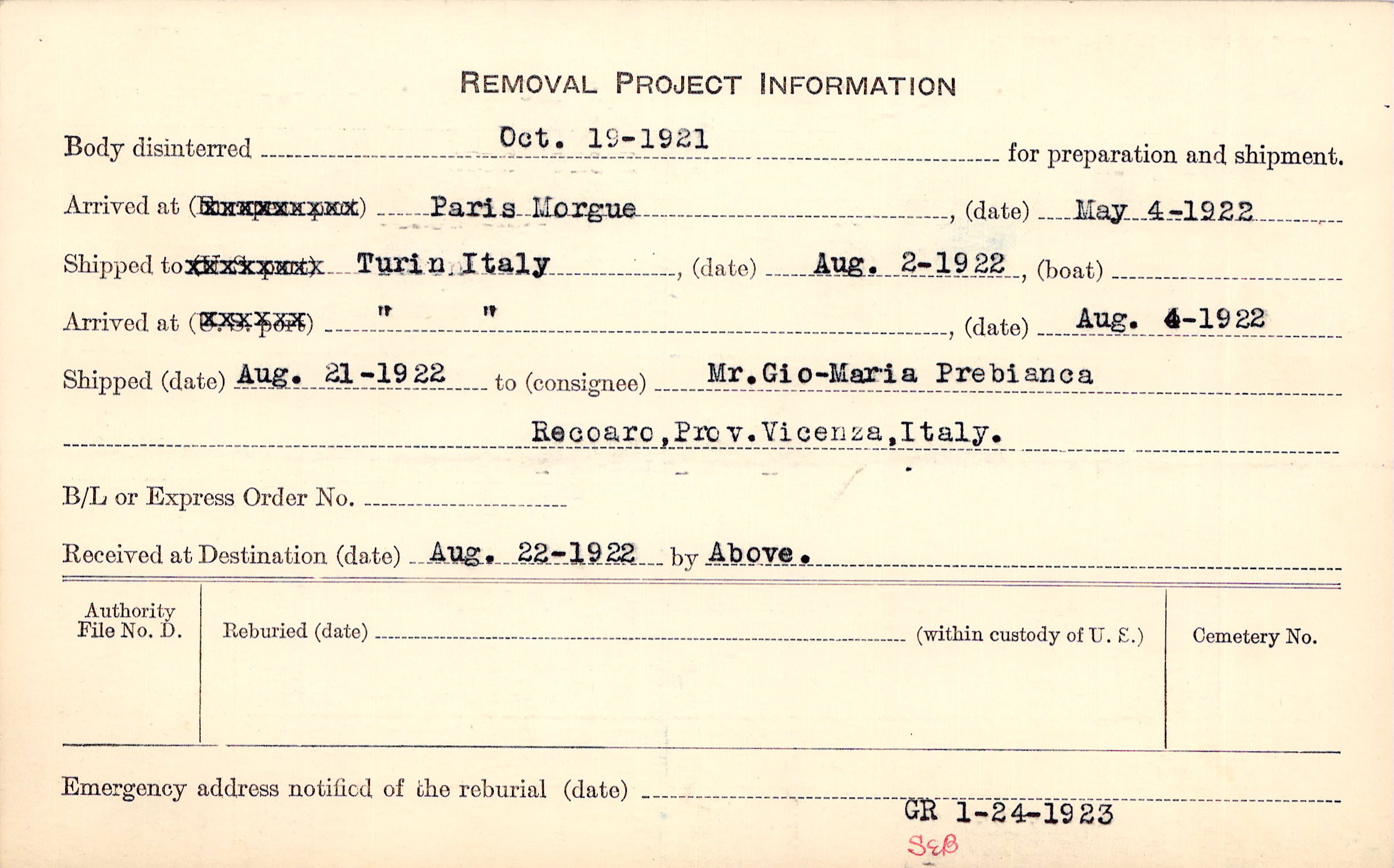 Body disinterred 10/19/1921 for preparation and shipment.