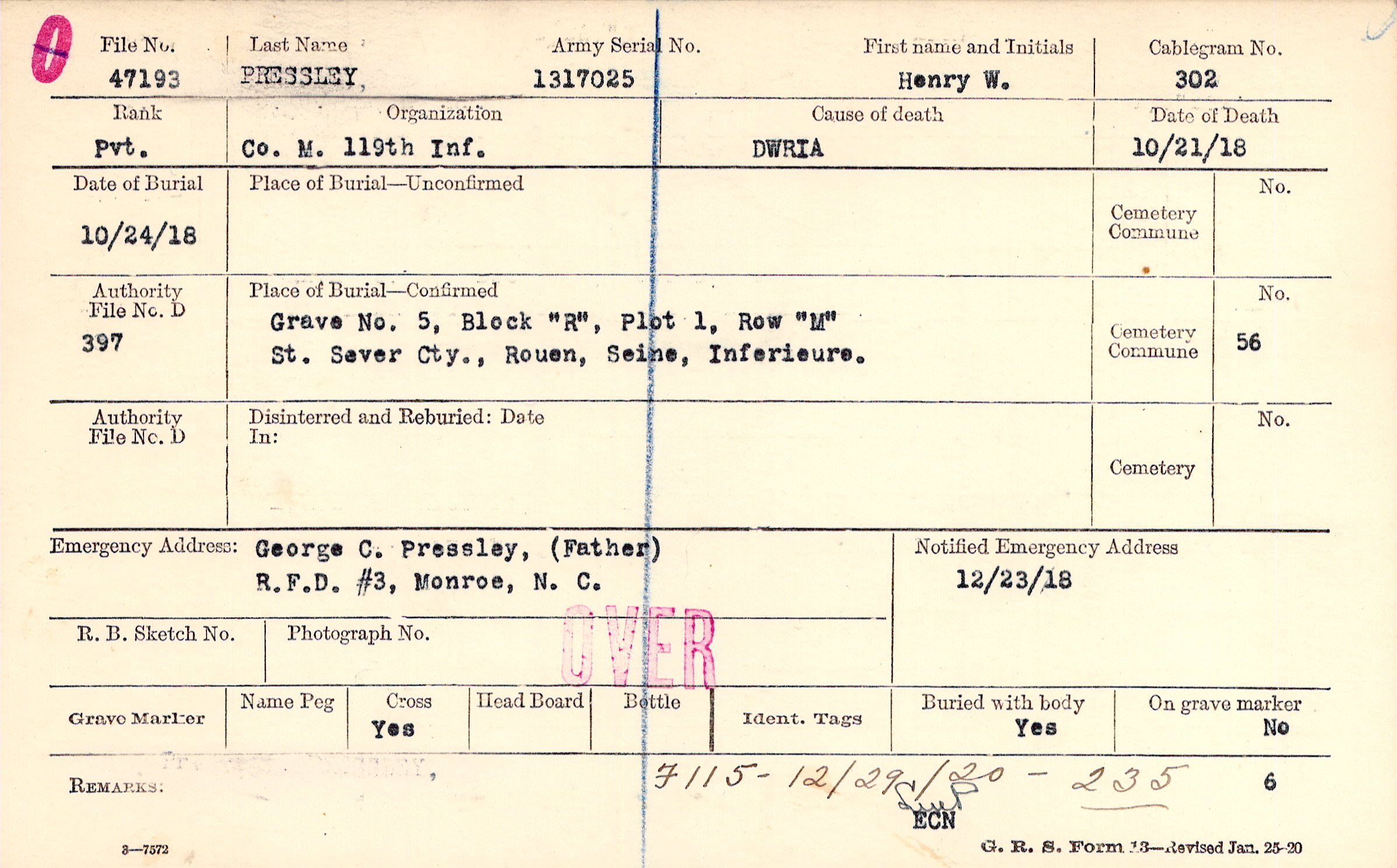 Grave 5, Block "R", Plot 1, Row "M", St. Sever Cty., Rouen, Seine, Inferieure