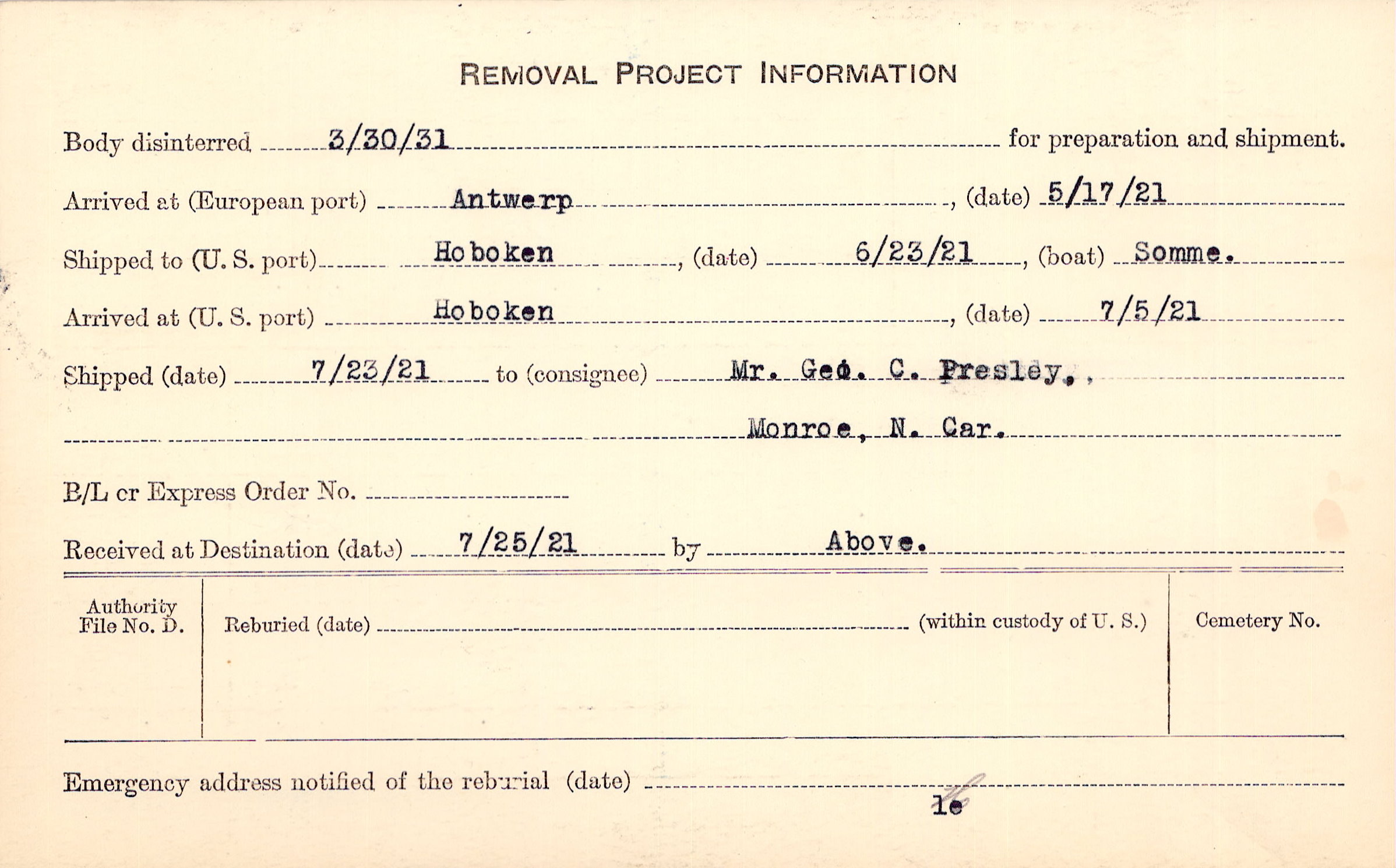 Body disinterred 3/30/1921 for preparation and shipment.