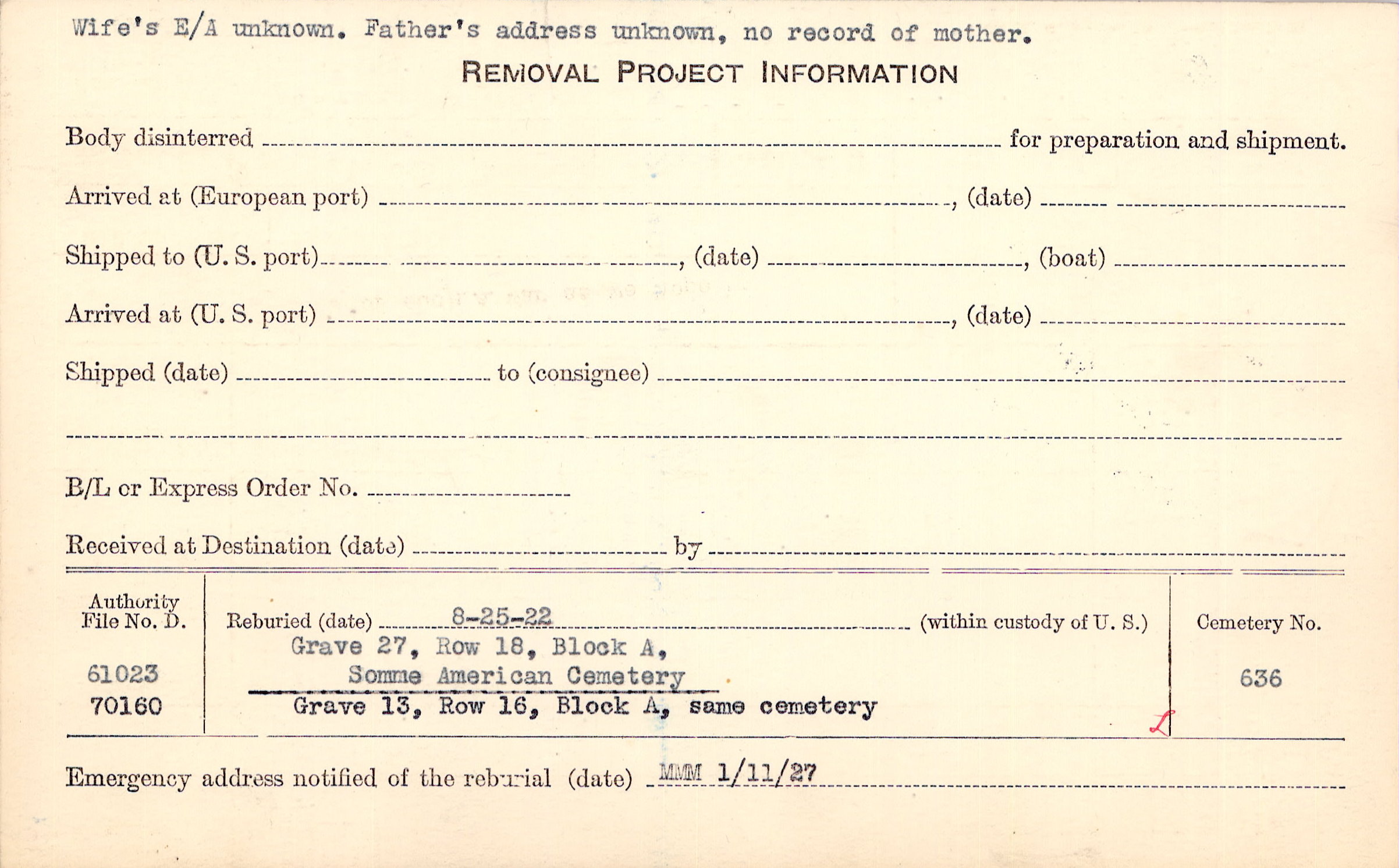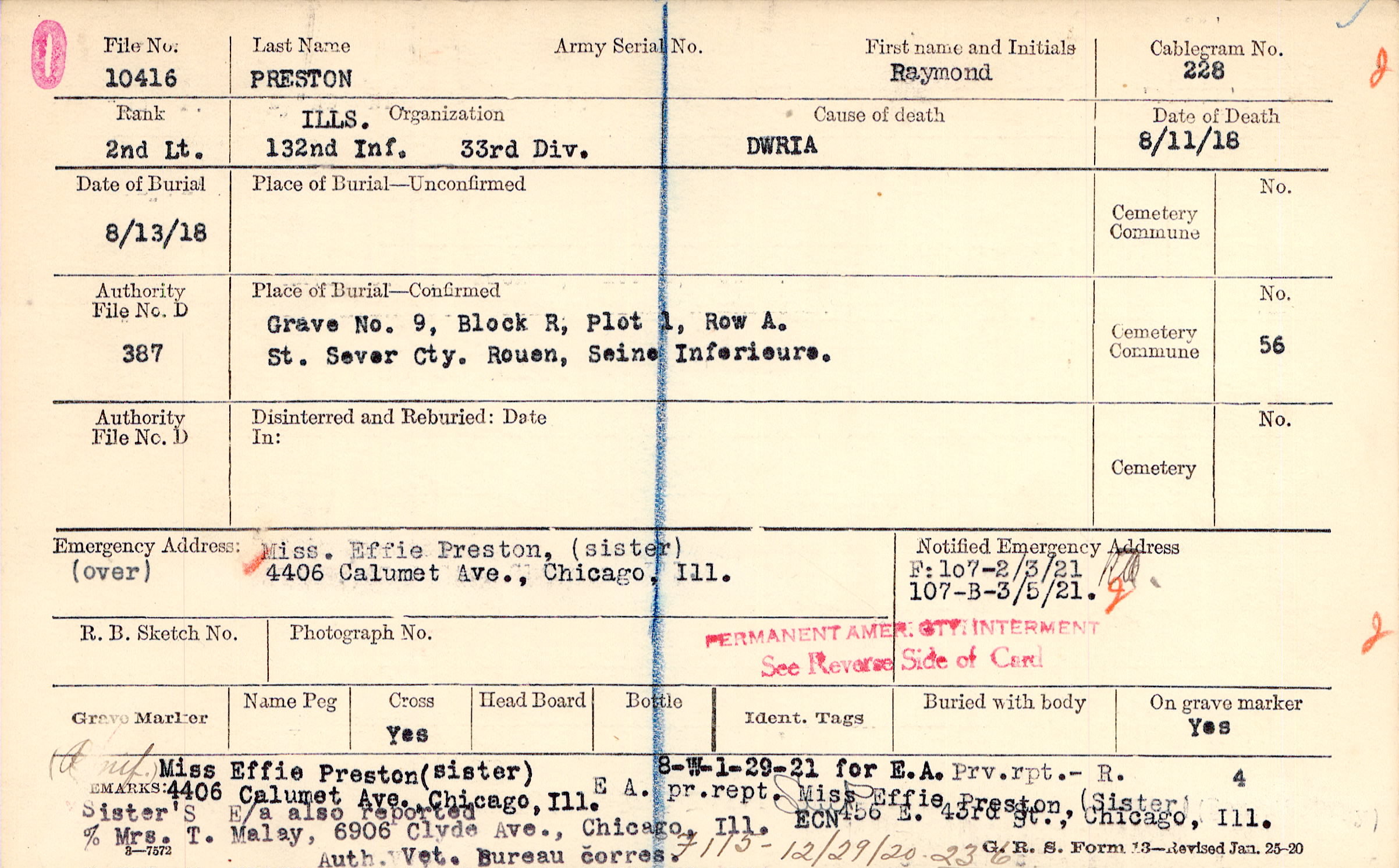 Miss Effie Preston (sister) 4406 Calumet Ave. Chicago, Ill. E.A. pr rept. Miss Effie Preston (Sister), 456 E. 43rd St., Chicago, Ill. Sister's E/a also reported % Mrs T. Malay, 6906 Clyde Ave., Chicago Ill. ECN Auth. Vet. Bureau corres., 8-W-1-29-21 for E.A., F115 - 12/29/20 - 236