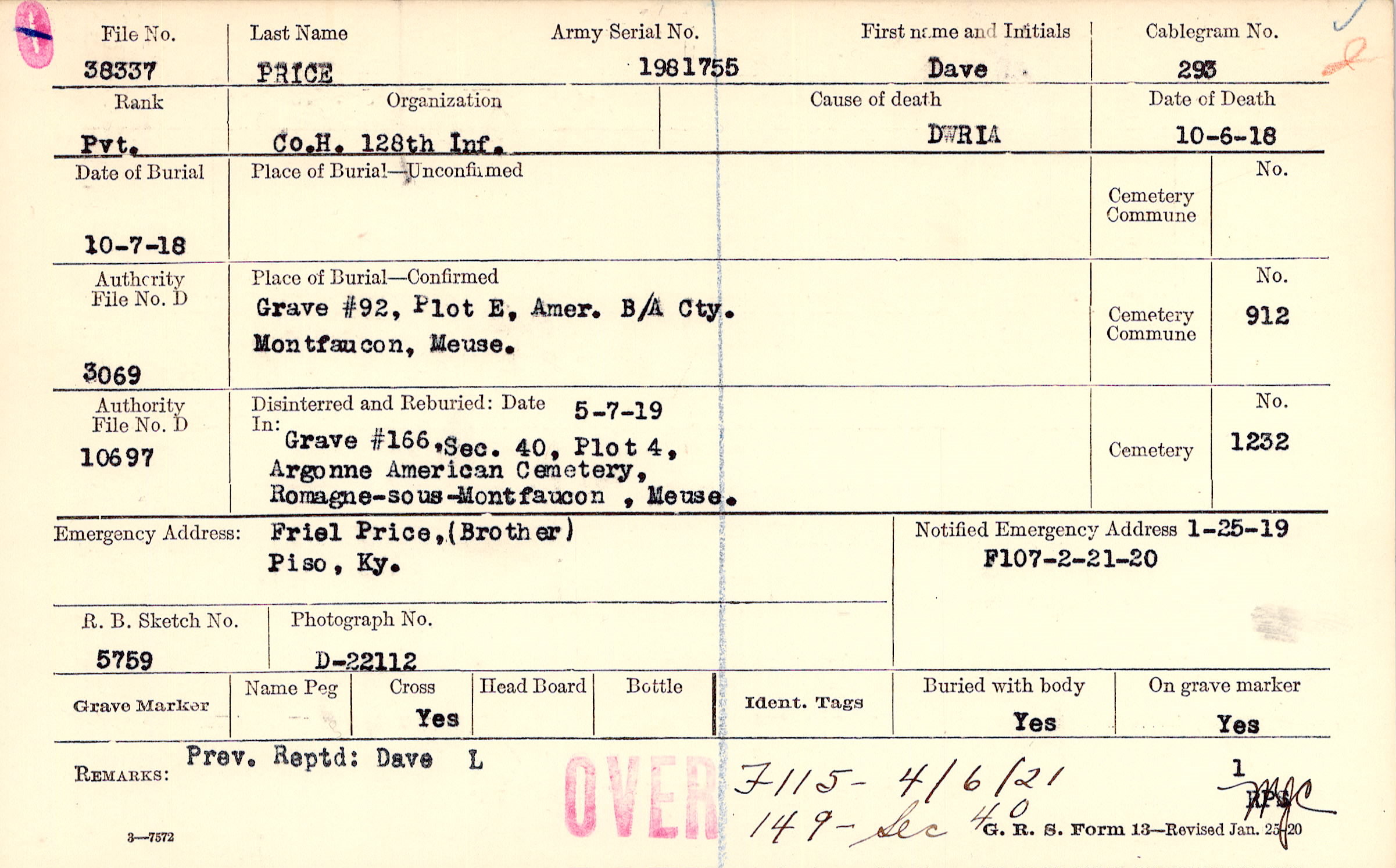 Grave #92, Plot E, Amer. B/A Cty., Montfaucon, Meuse.