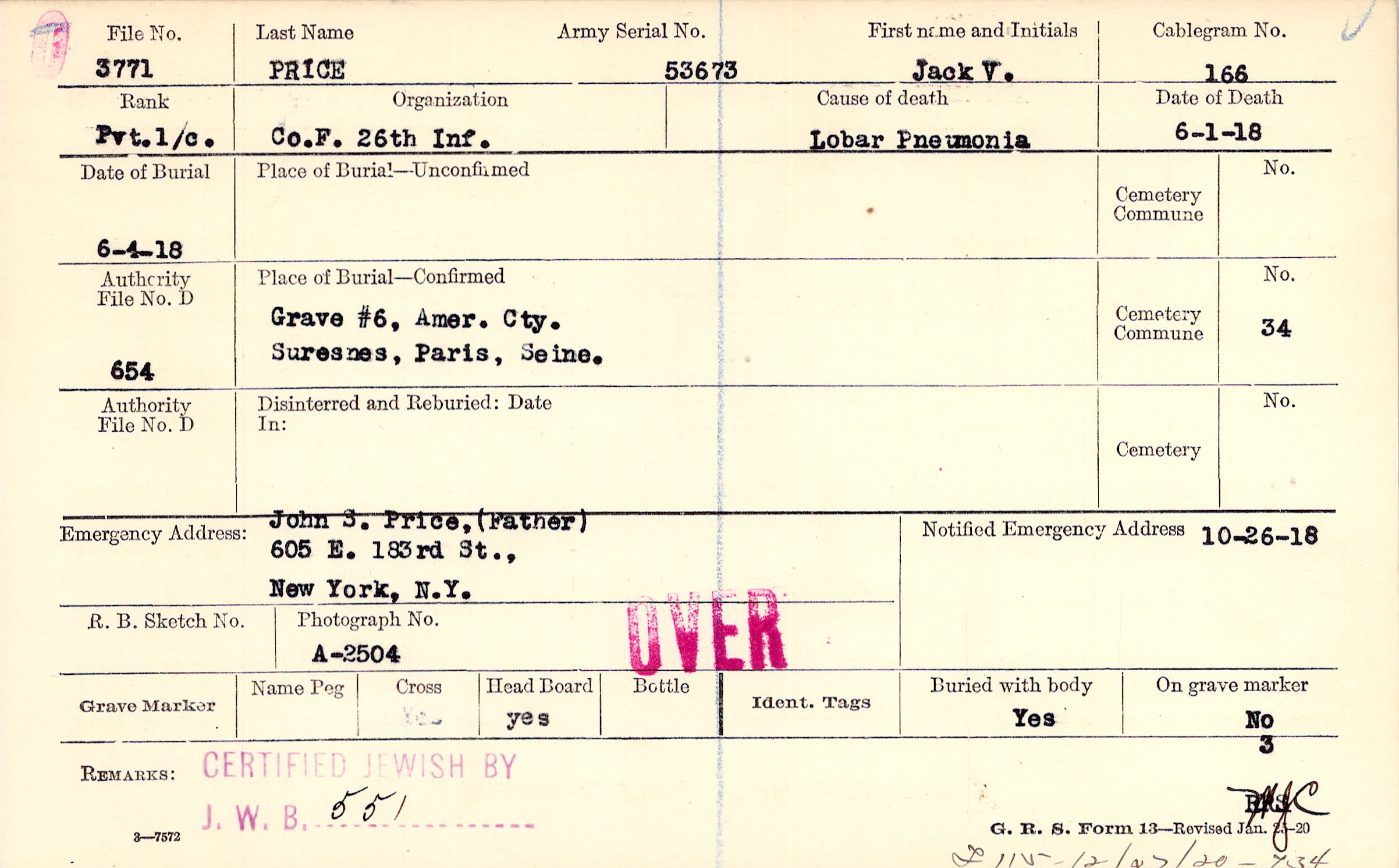 John S. Price, (Father), 605 E. 183rd St., New York, N.Y.