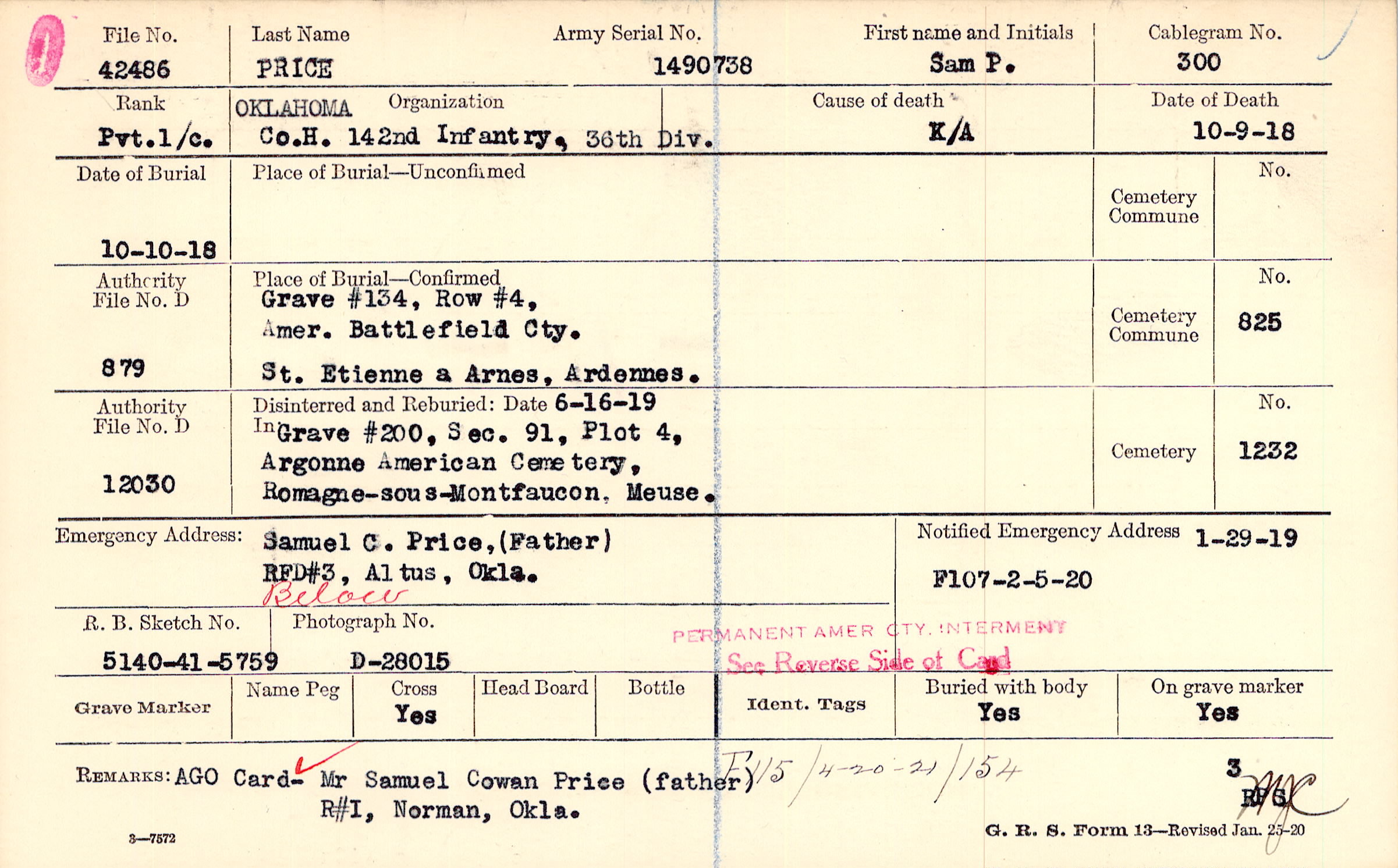 AGO Card- Mr Samuel Cowan Price (father) R#I, Norman, Okla., F115 /4-20-21/154
