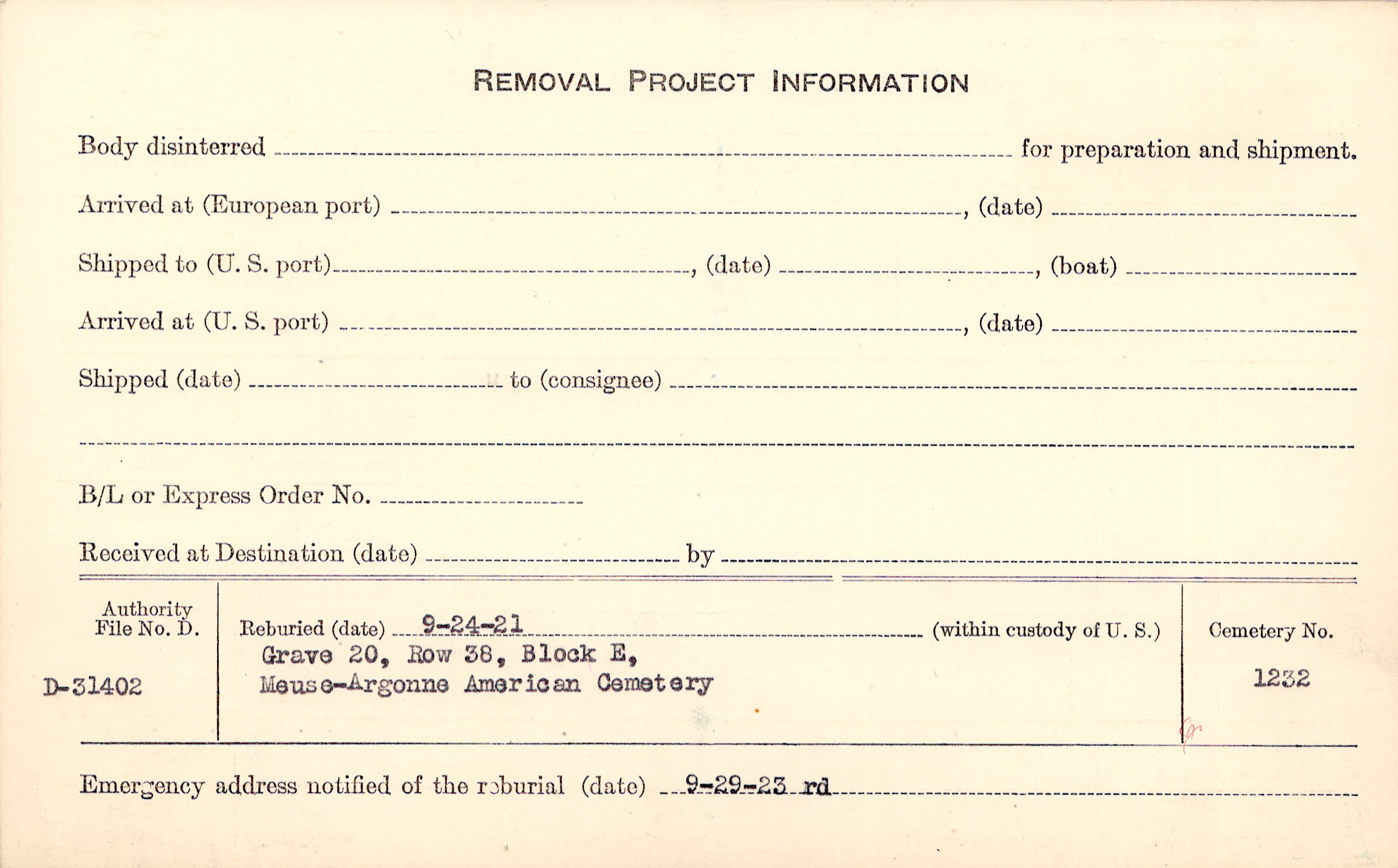 | Permanent Burial in Foreign Cemetery |