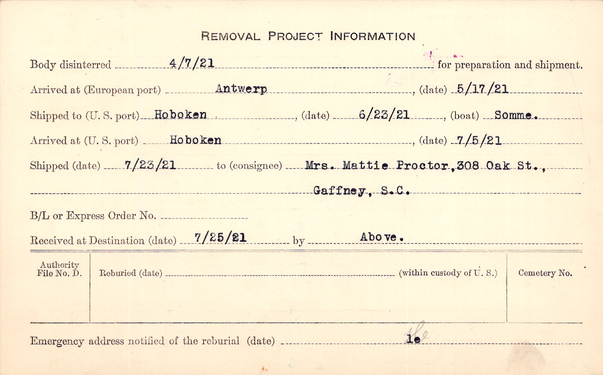 Body disinterred 4/7/1921 for preparation and shipment.