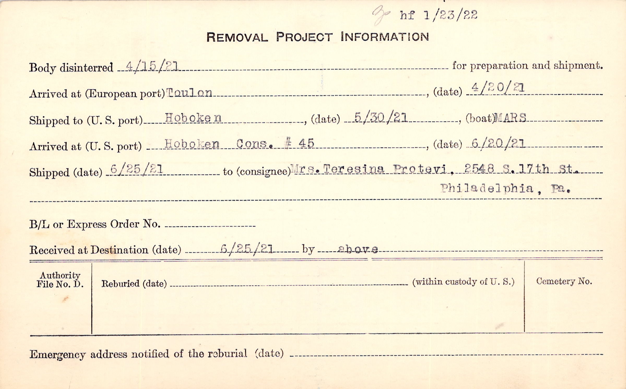 Body disinterred 4/15/1921 for preparation and shipment.