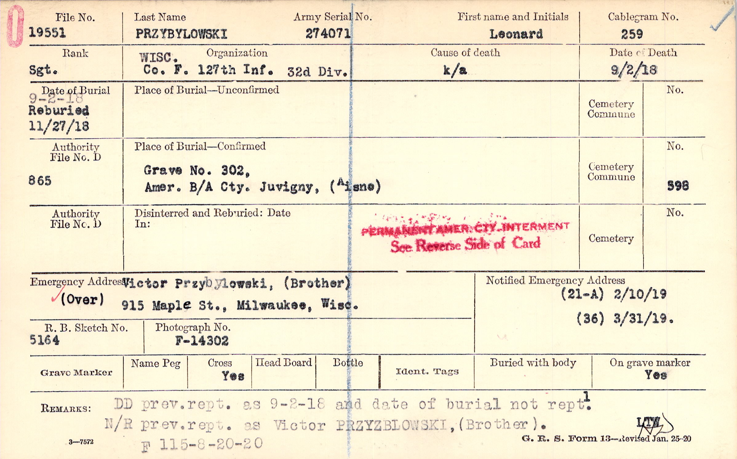 DD prev. rept. as 9-2-18 and date of burial not rept. N/R prev. rept. as Victor PRZYZBLOWSKI, (Brother).