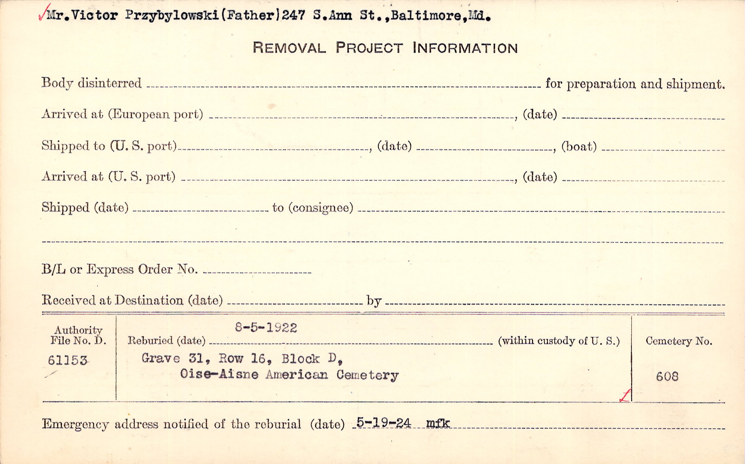 Mr. Victor Przybylowski (Father) 247 S. Ann St., Baltimore, Md. |