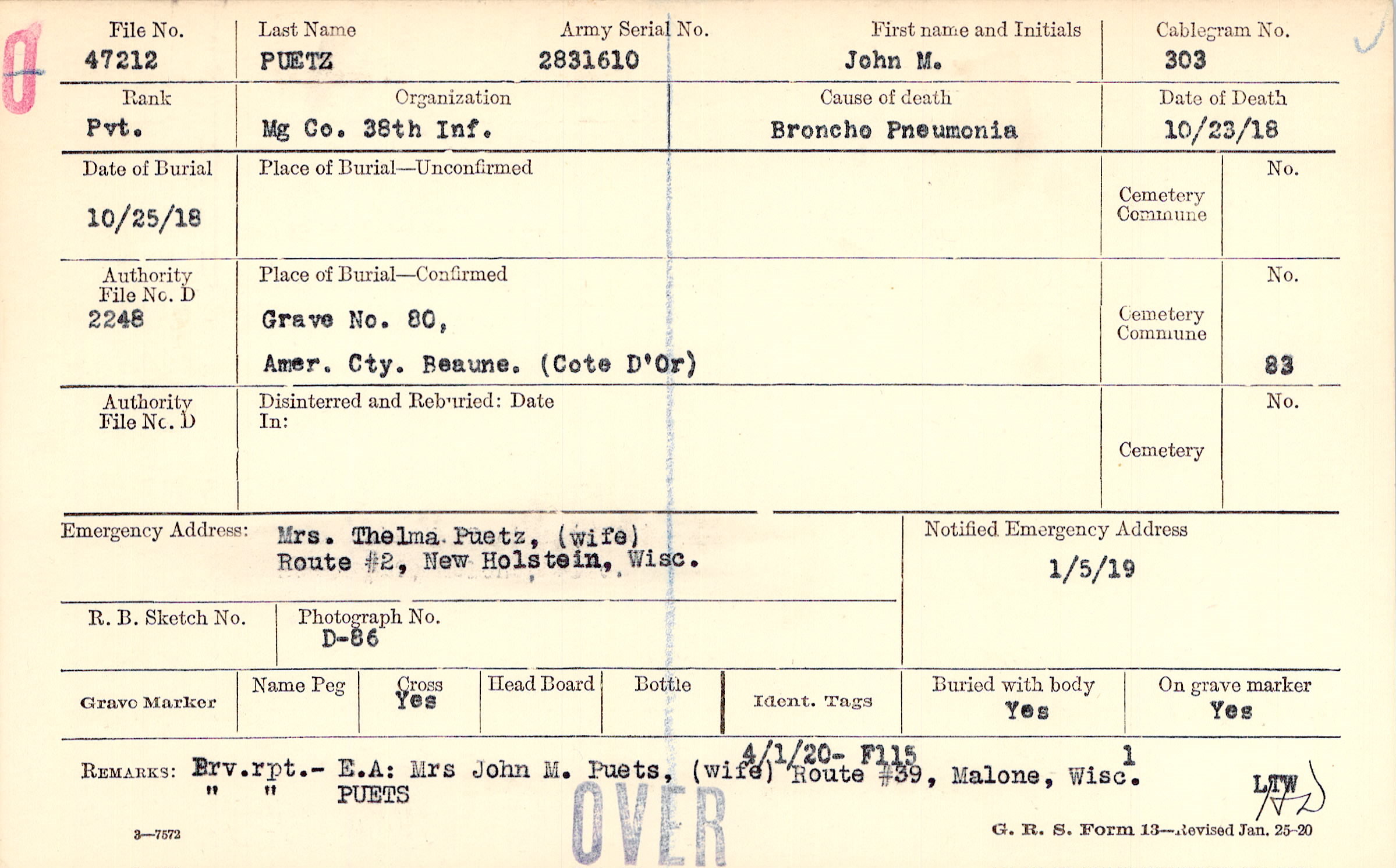 Prv. rpt.- E.A: Mrs John M. Puets, (wife0, Route #39, Malone, Wisc. Prv. rpt. PUETS, 4/1/20 - F115