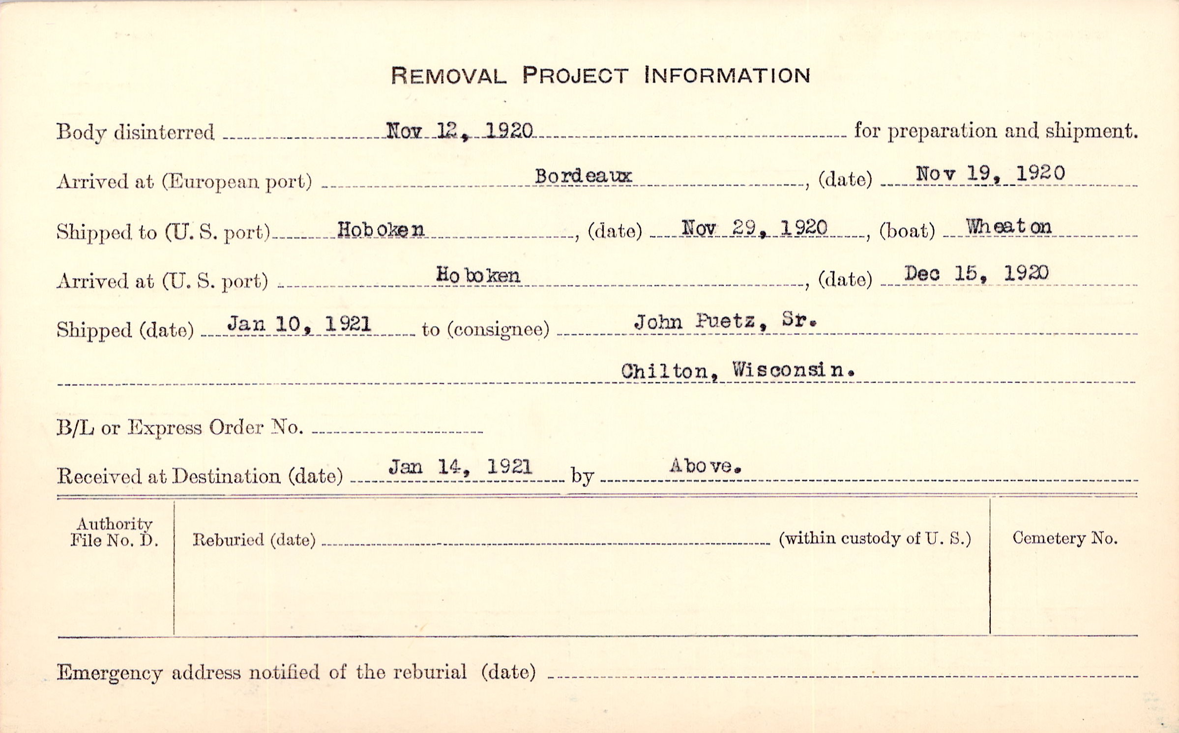 Body disinterred 11/12/1920 for preparation and shipment.