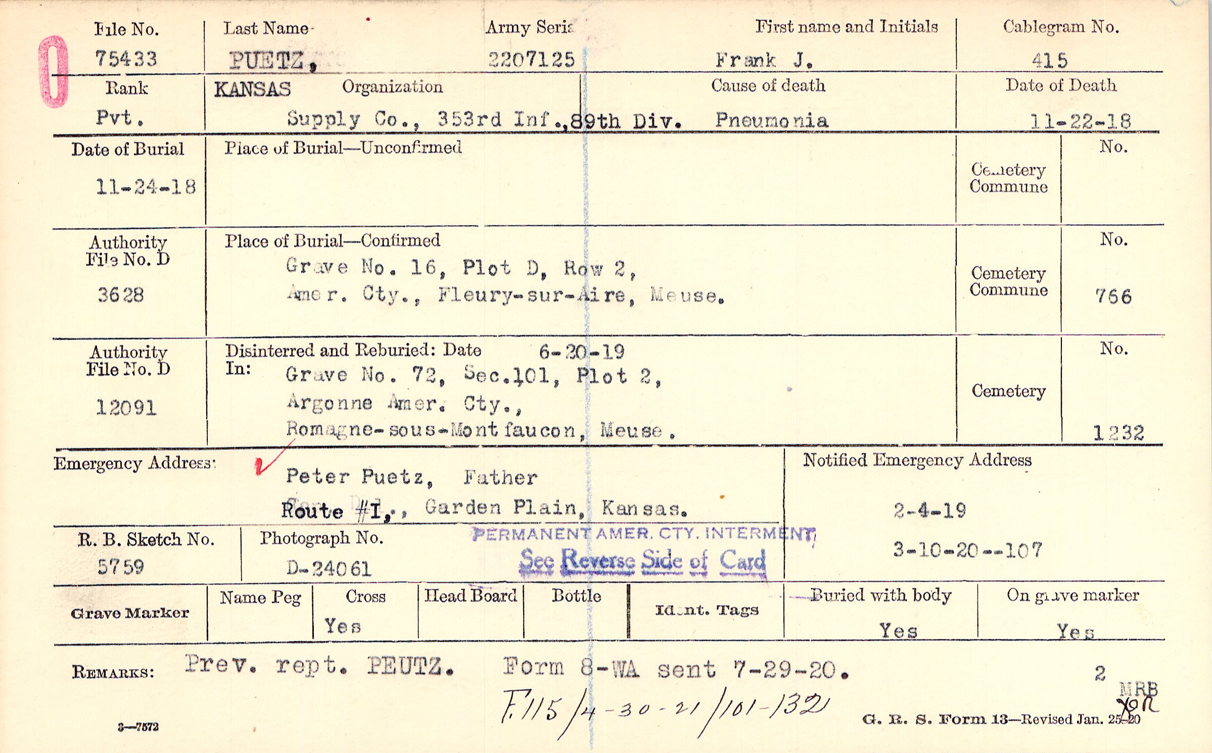 Grave 72, Section 101, Plot 2, Argonne American Cemetery, Romagne-sous-Montfaucon, Meuse