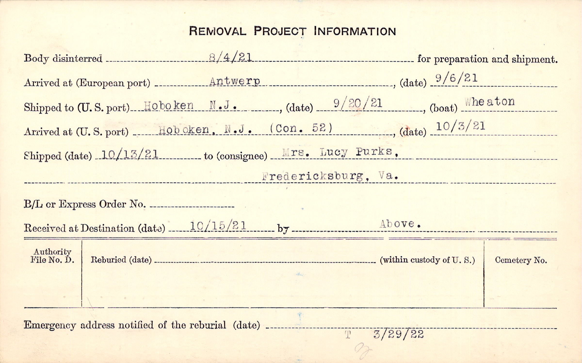 Body disinterred 8/4/1921 for preparation and shipment.