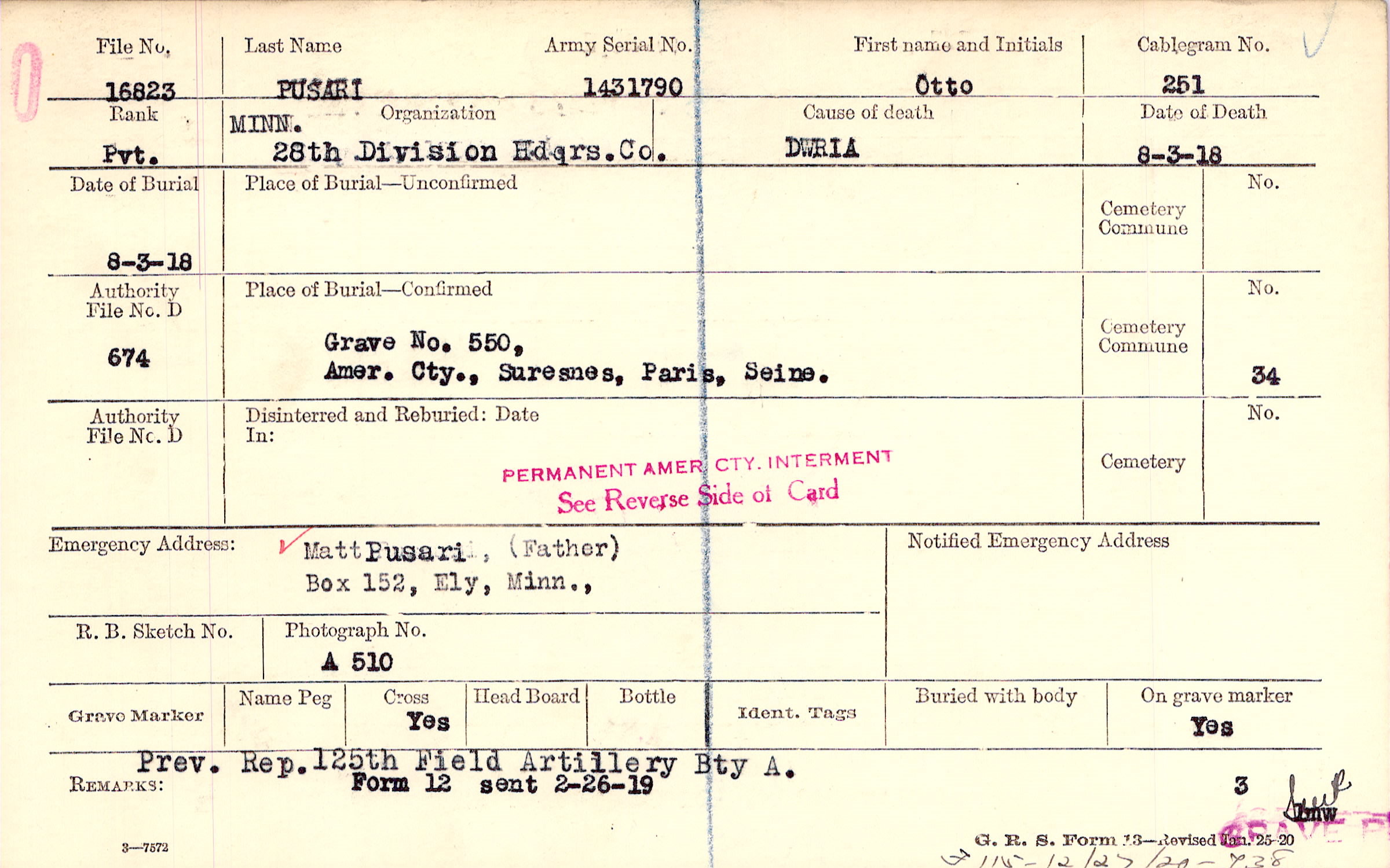 Matt Pusari, (Father), Box 152, Ely, Minn.,