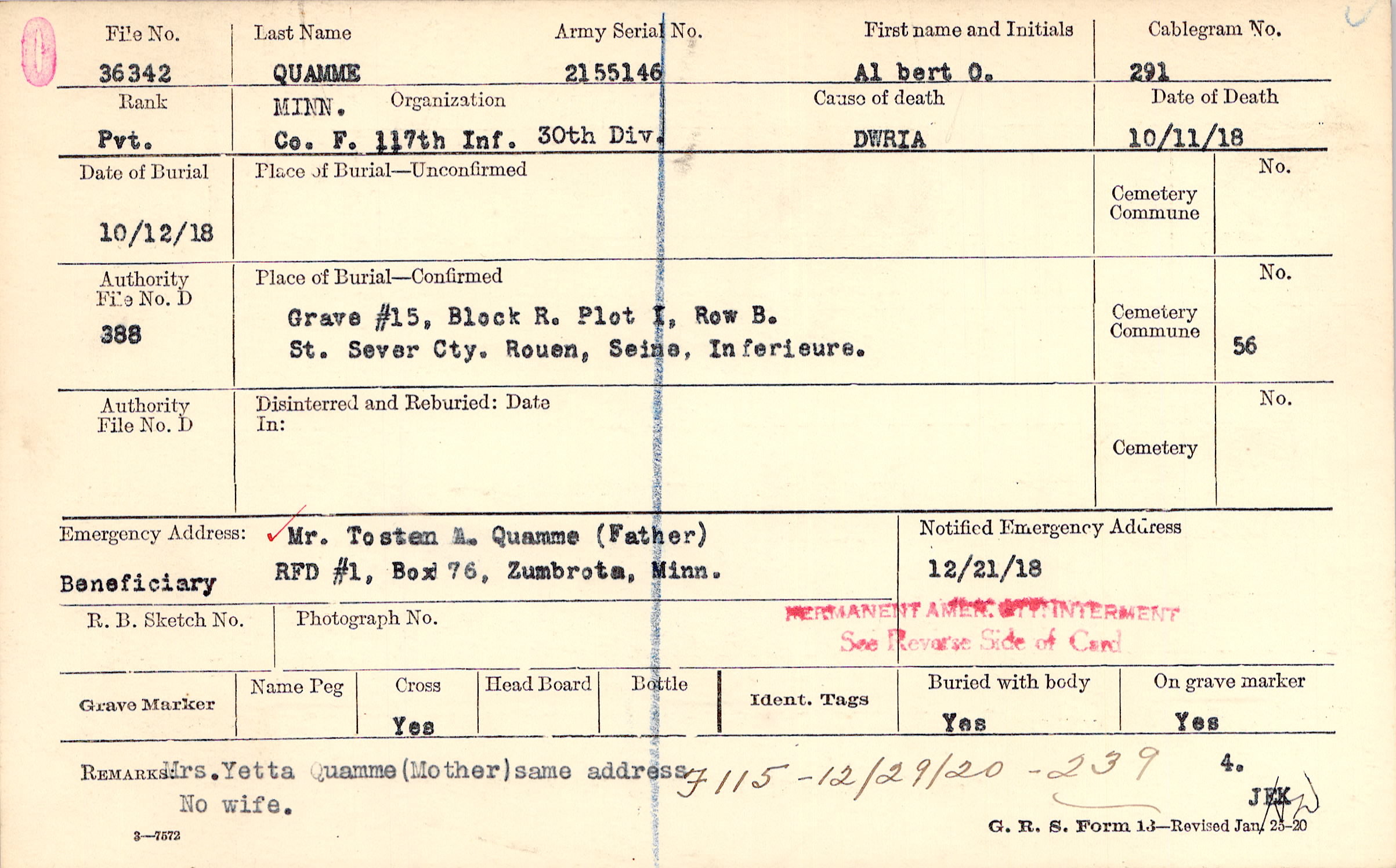 Mr. Tosten A. Quamme (Father), RFD #1, Box 76, Zumbrota, Minn., Beneficiary