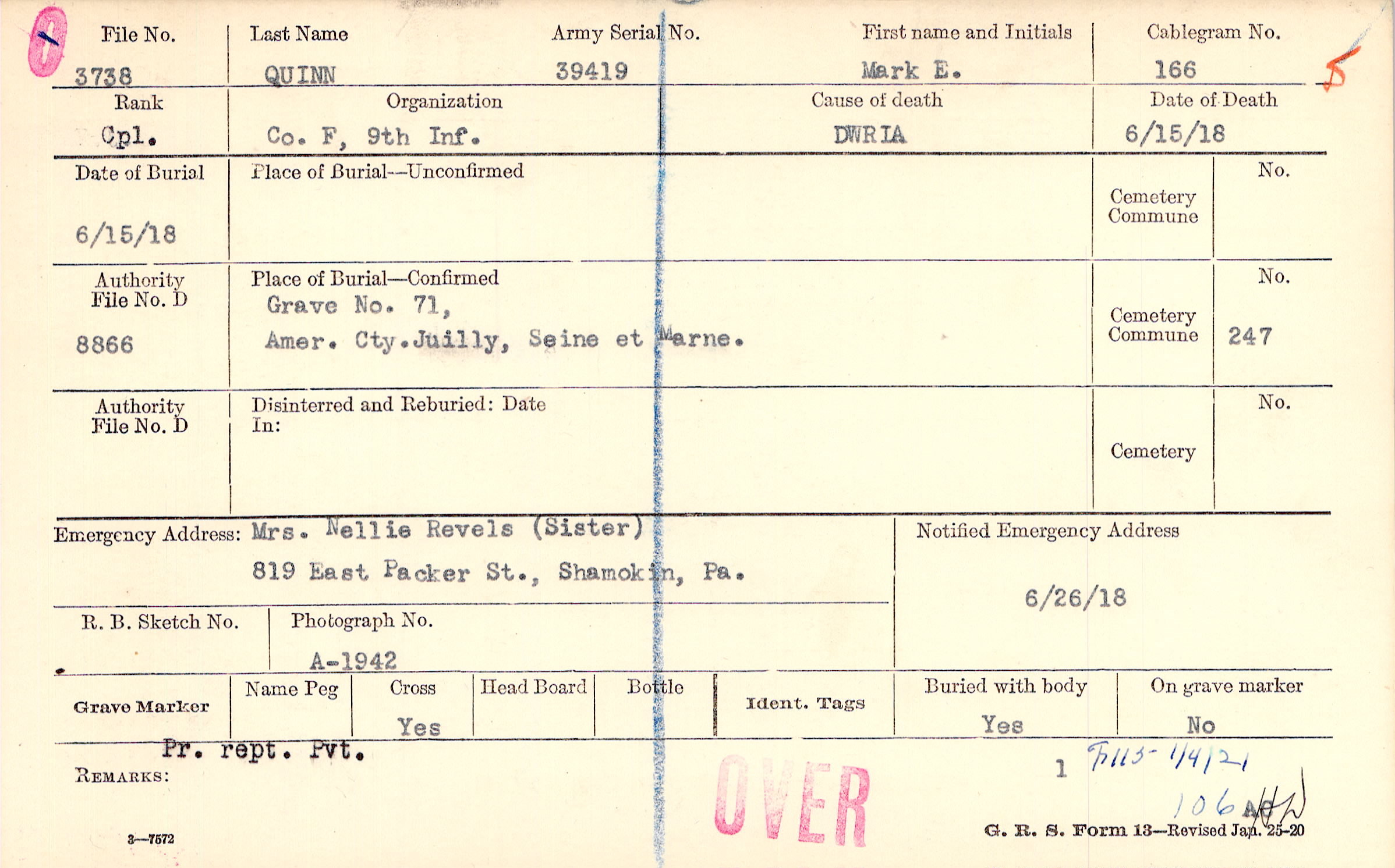 Mrs. Nellie Revels (Sister), 819 East Packer St., Shamokin, Pa.