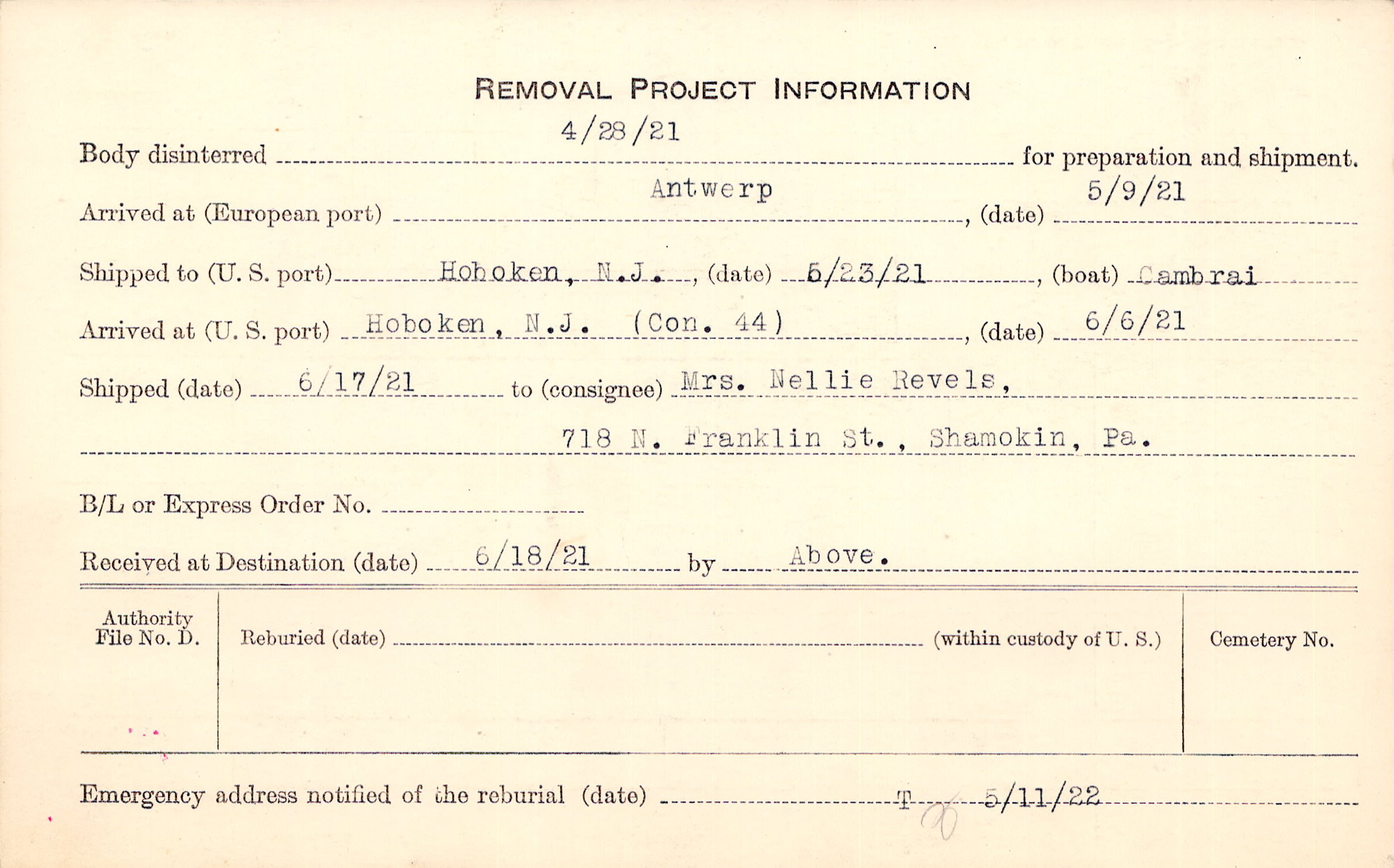 Body disinterred 4/28/1921 for preparation and shipment.