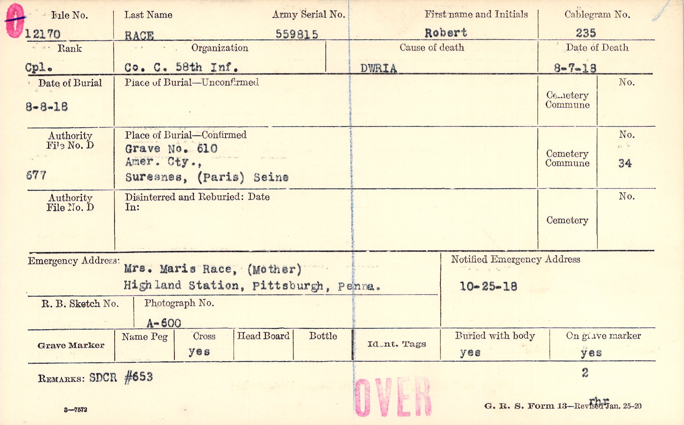 Grave 610, Amer. Cty., Suresnes, (Paris) Seine.