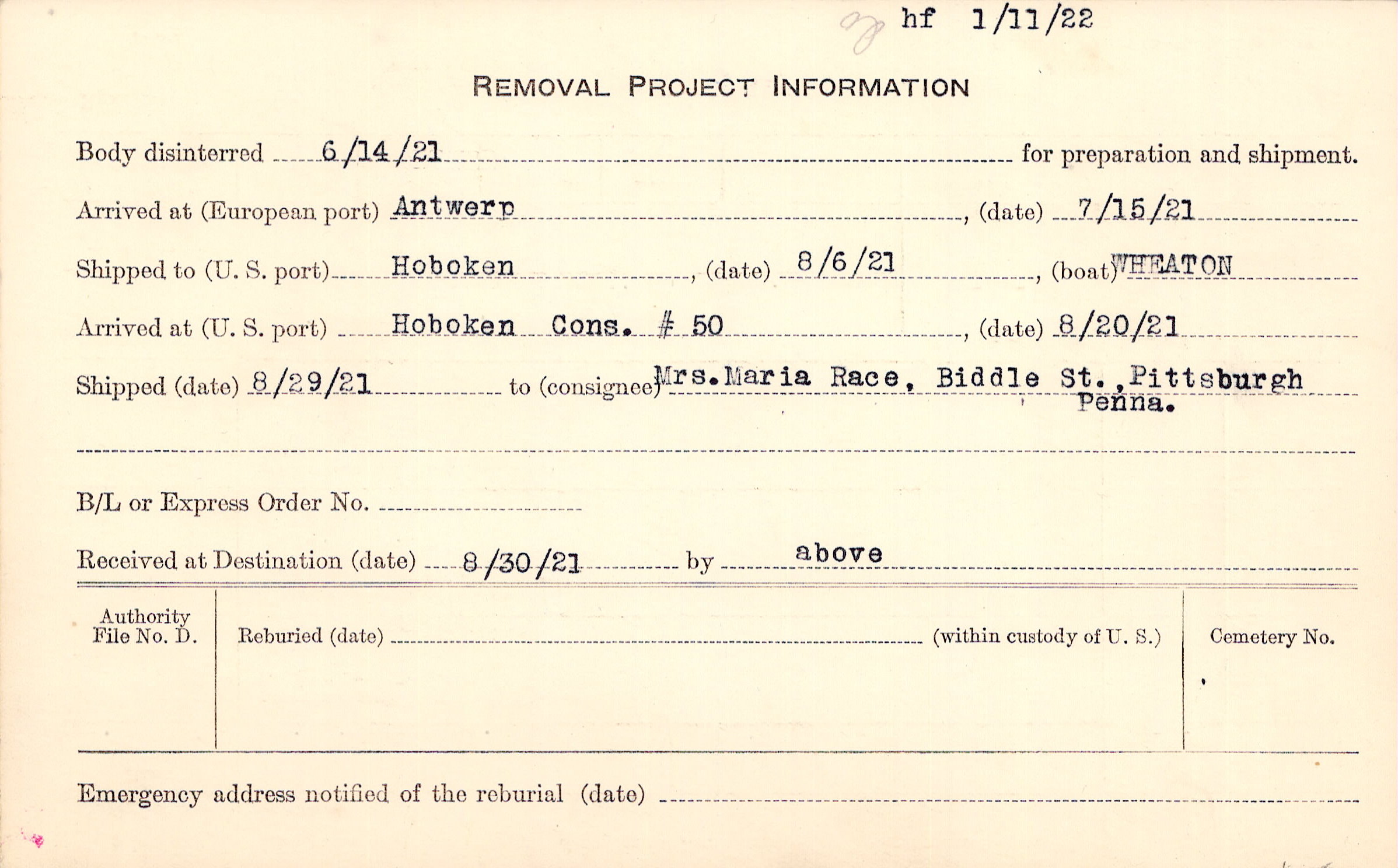 Body disinterred 6/14/1921 for preparation and shipment.