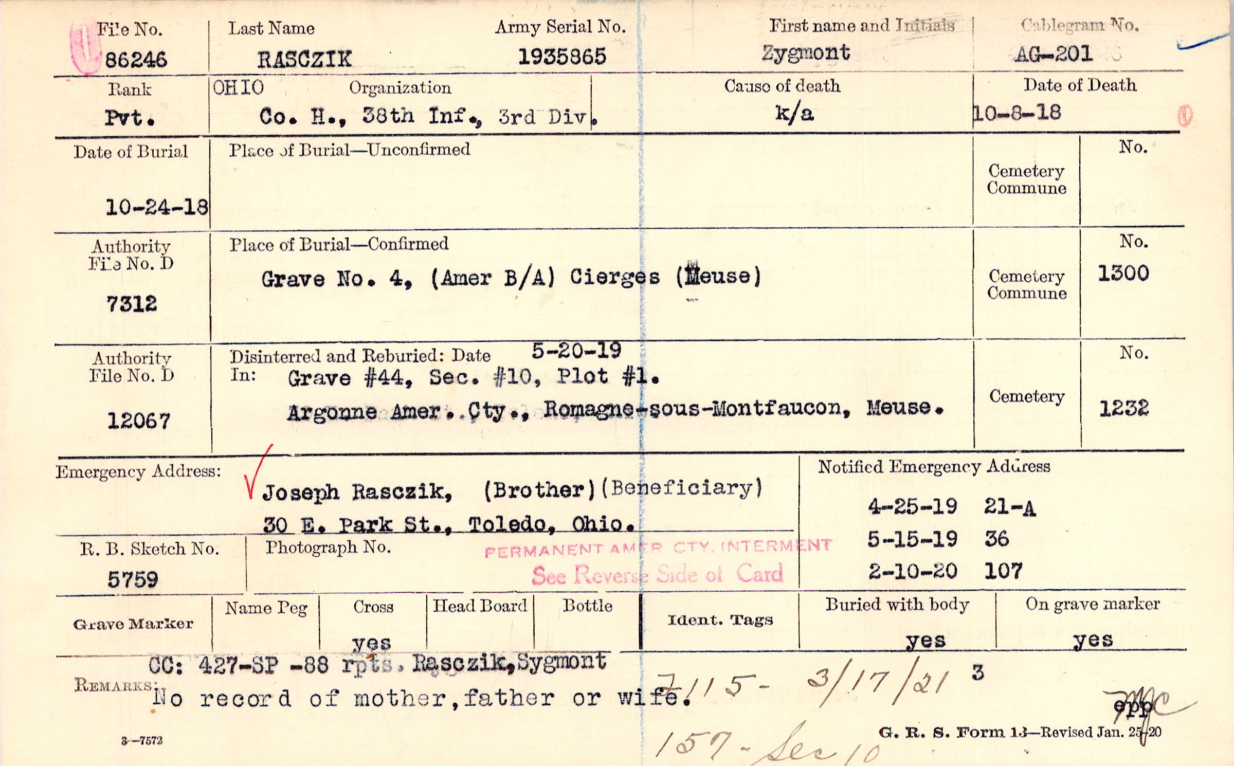 CC: 427-SP -88 rpts. Rasczik, Sygmont No record of mother, father or wife, F115- 3/17/21 157 - Sec 10