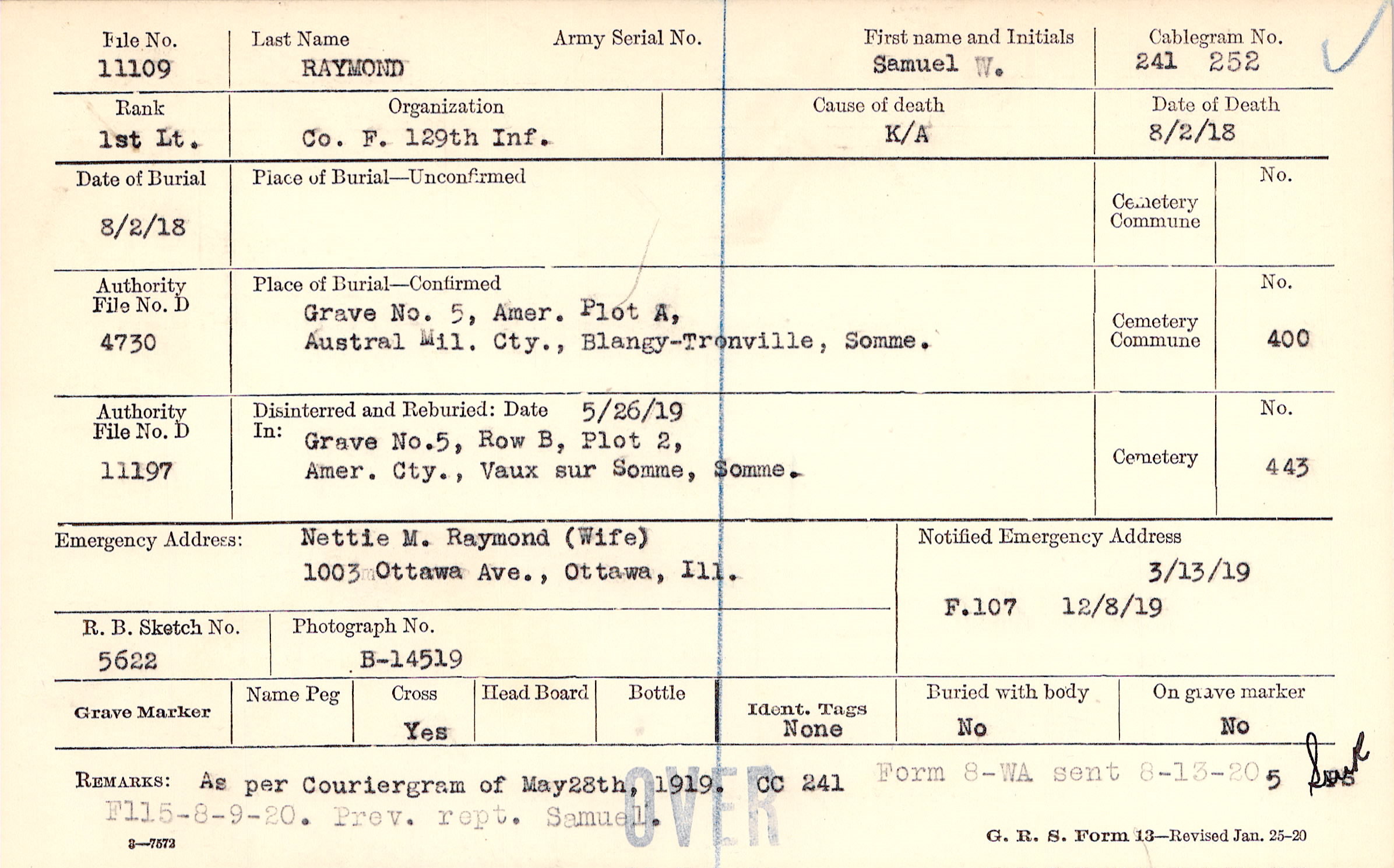 As per Couriergram of May28th, 1919. CC 241, Form 8-WA sent 8-13-20, F115-8-9-20. Prev. rept. Samuel.