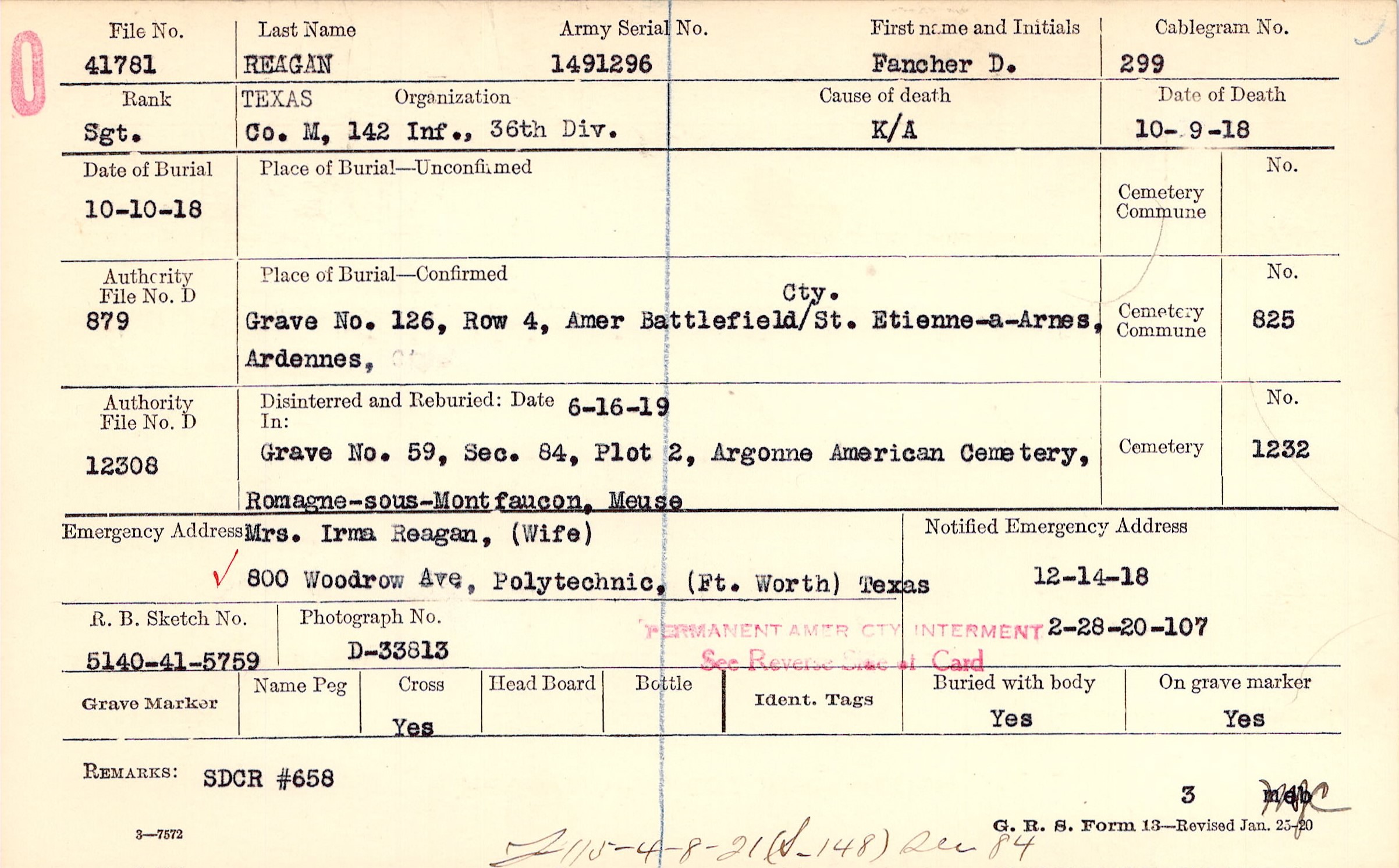 Mrs. Irma Reagan, (Wife), 800 Woodrow Ave., Polytechnic, (Ft. Worth) Texas
