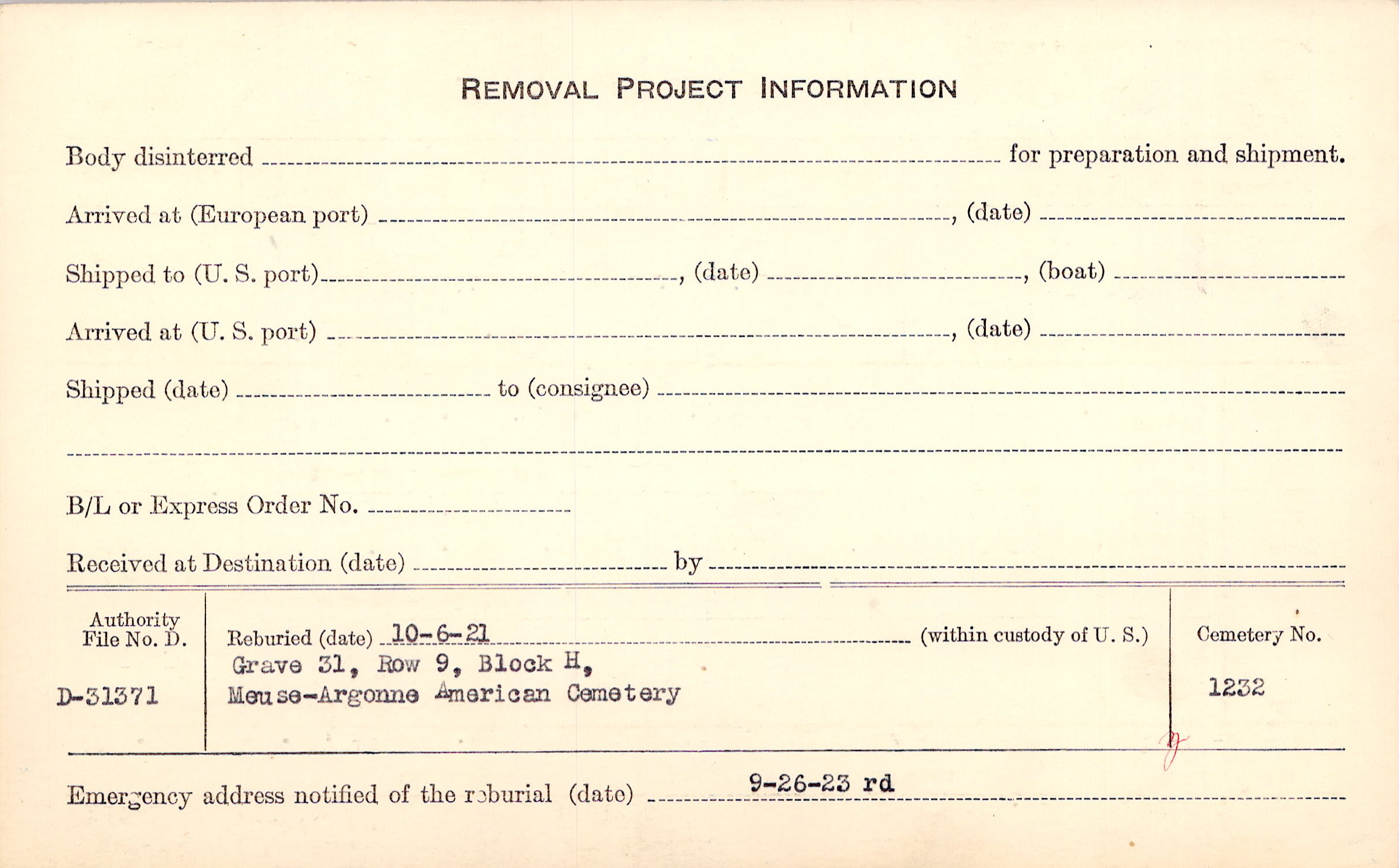 | Permanent Burial in Foreign Cemetery |
