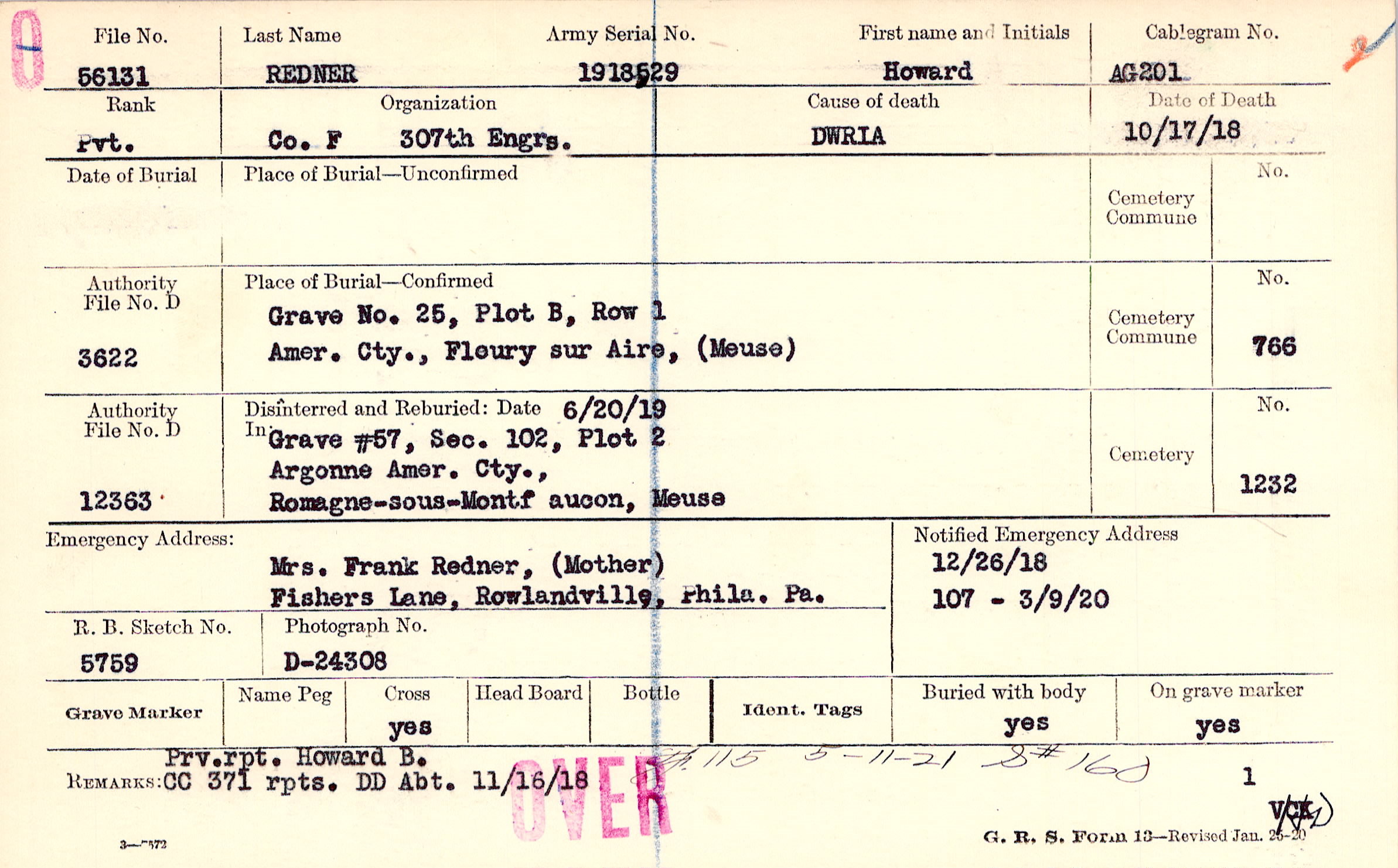 Grave 25, Plot B, Row 1, Amer. Cty., Fleury sur Aire, (Meuse)