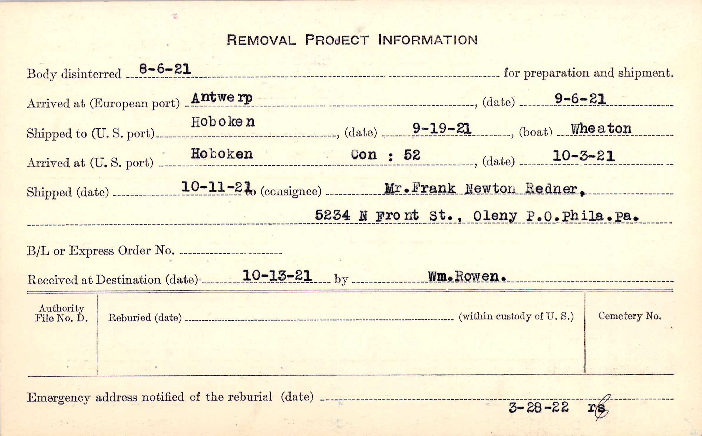 Body disinterred 8/6/1921 for preparation and shipment.