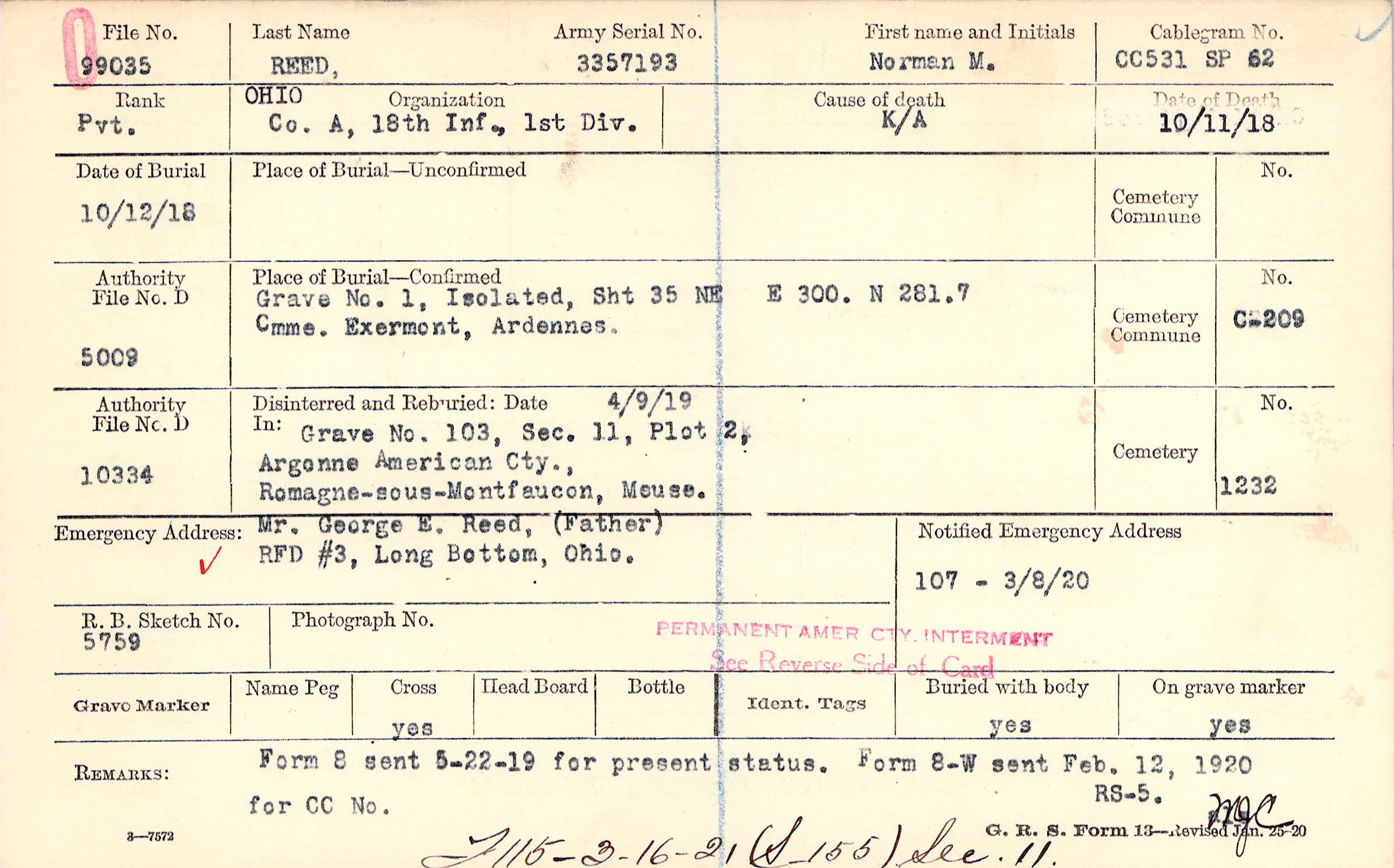 Mr. George E. Reed, (Father), RFD #3, Long Bottom, Ohio.