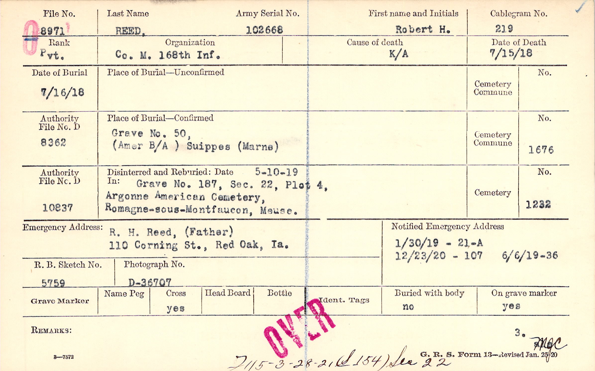 R. H. Reed, (Father), 110 Corning St., Red Oak, Ia.