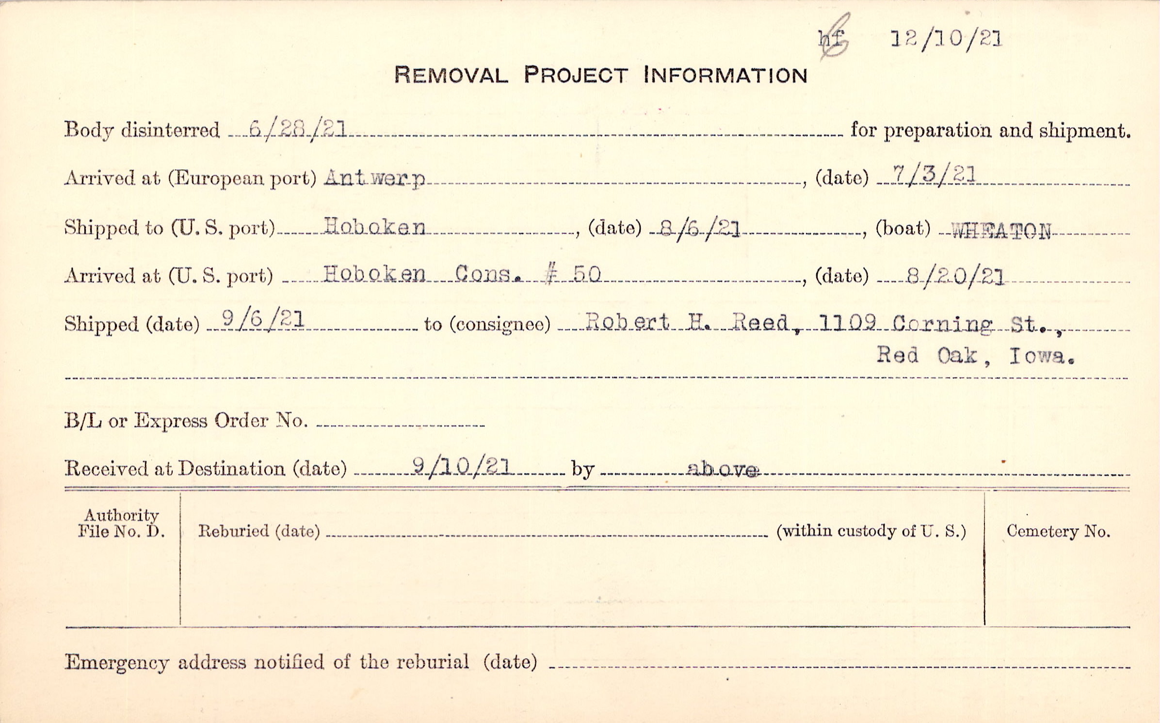 Body disinterred 6/28/1921 for preparation and shipment.