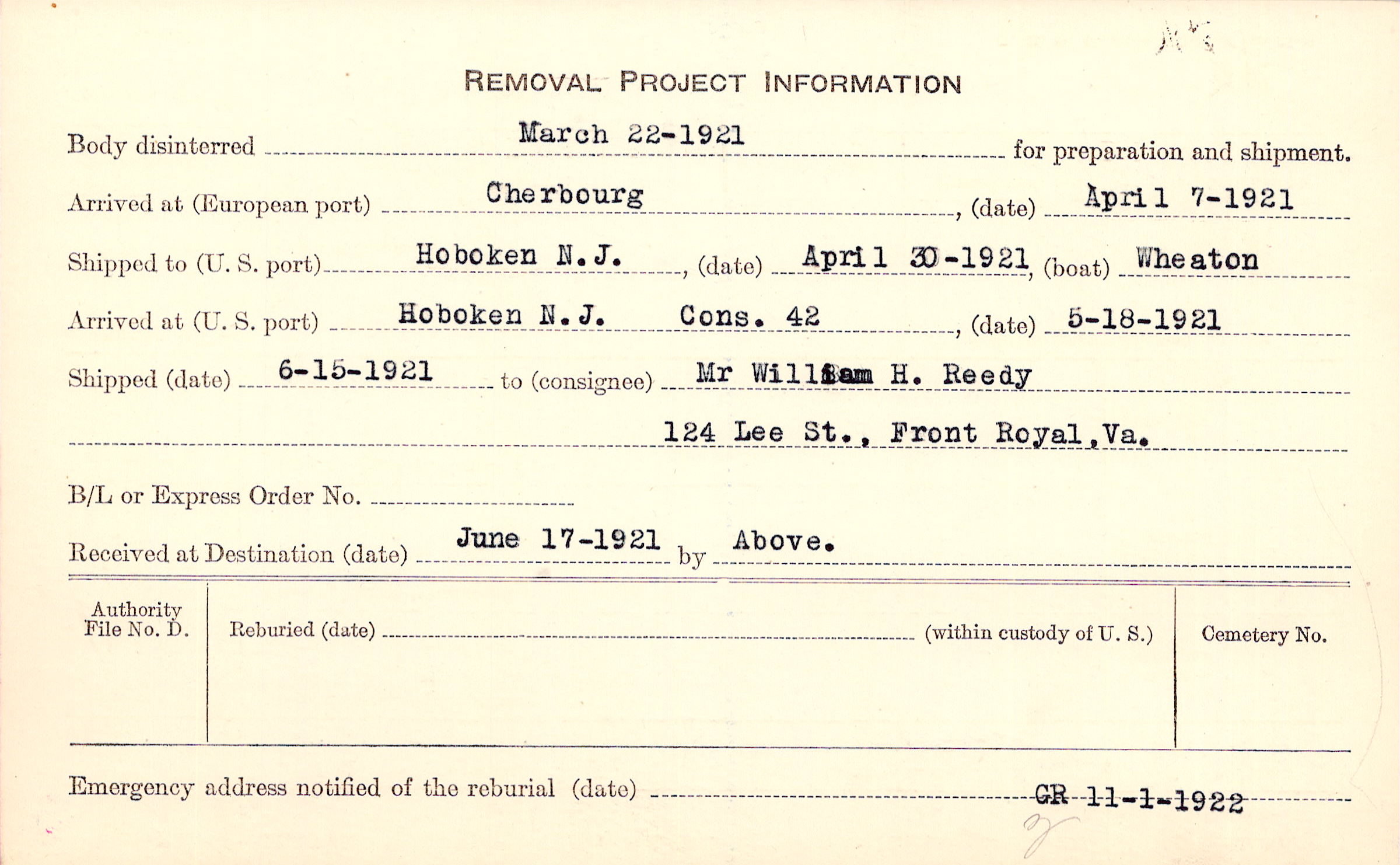 Body disinterred 3/22/1921 for preparation and shipment.
