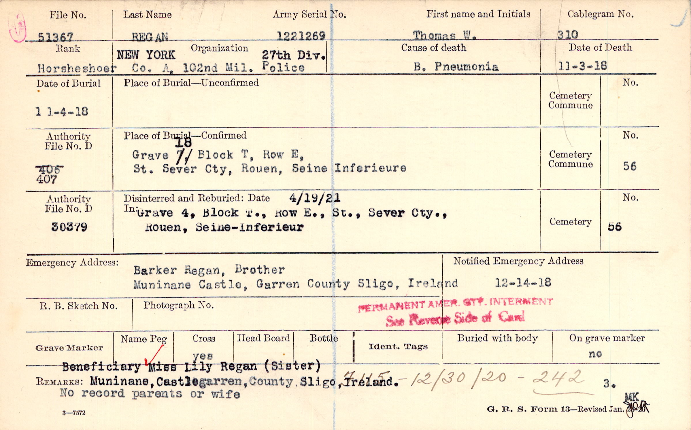 Beneficiary Miss Lily Regan (Sister), Muninane, Castlegarren, County Sligo, Ireland. No record parents or wife, F115 - 12/30/20 - 242