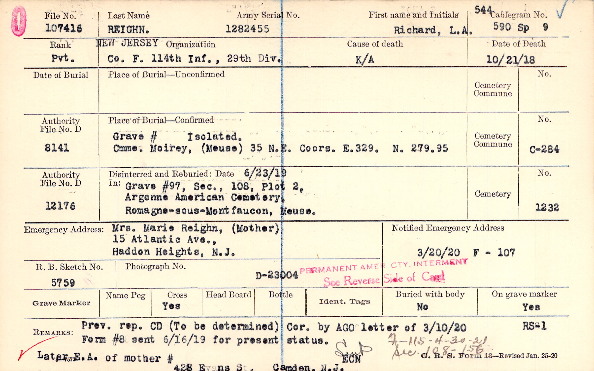 Mrs. Marie Reighn, (Mother), 15 Atlantic Ave., Haddon Heights, N.J.