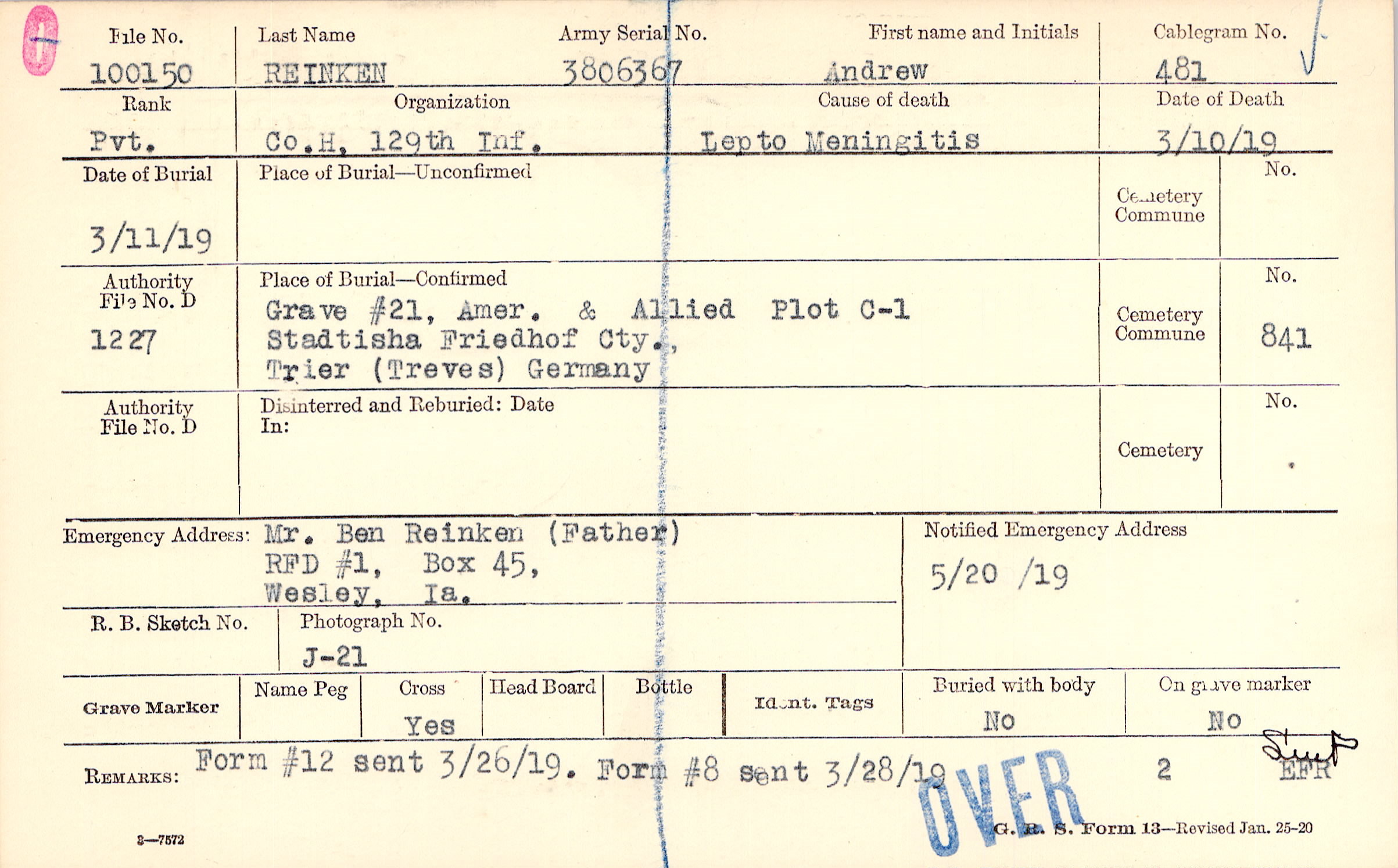 Mr. Ben Reinken (Father), RFD #1, Box 45, Wesley, Ia.