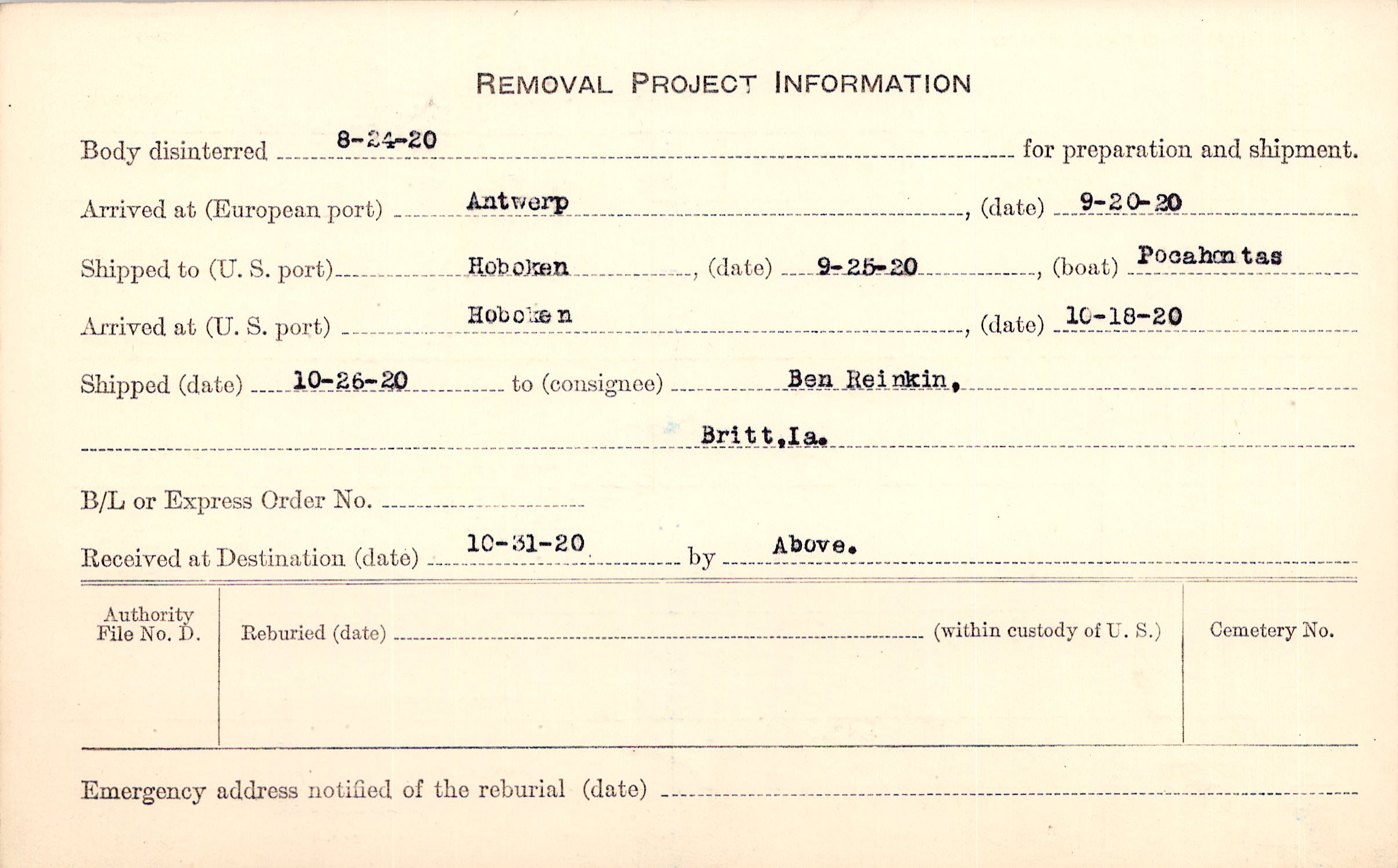 Body disinterred 8/24/1920 for preparation and shipment.