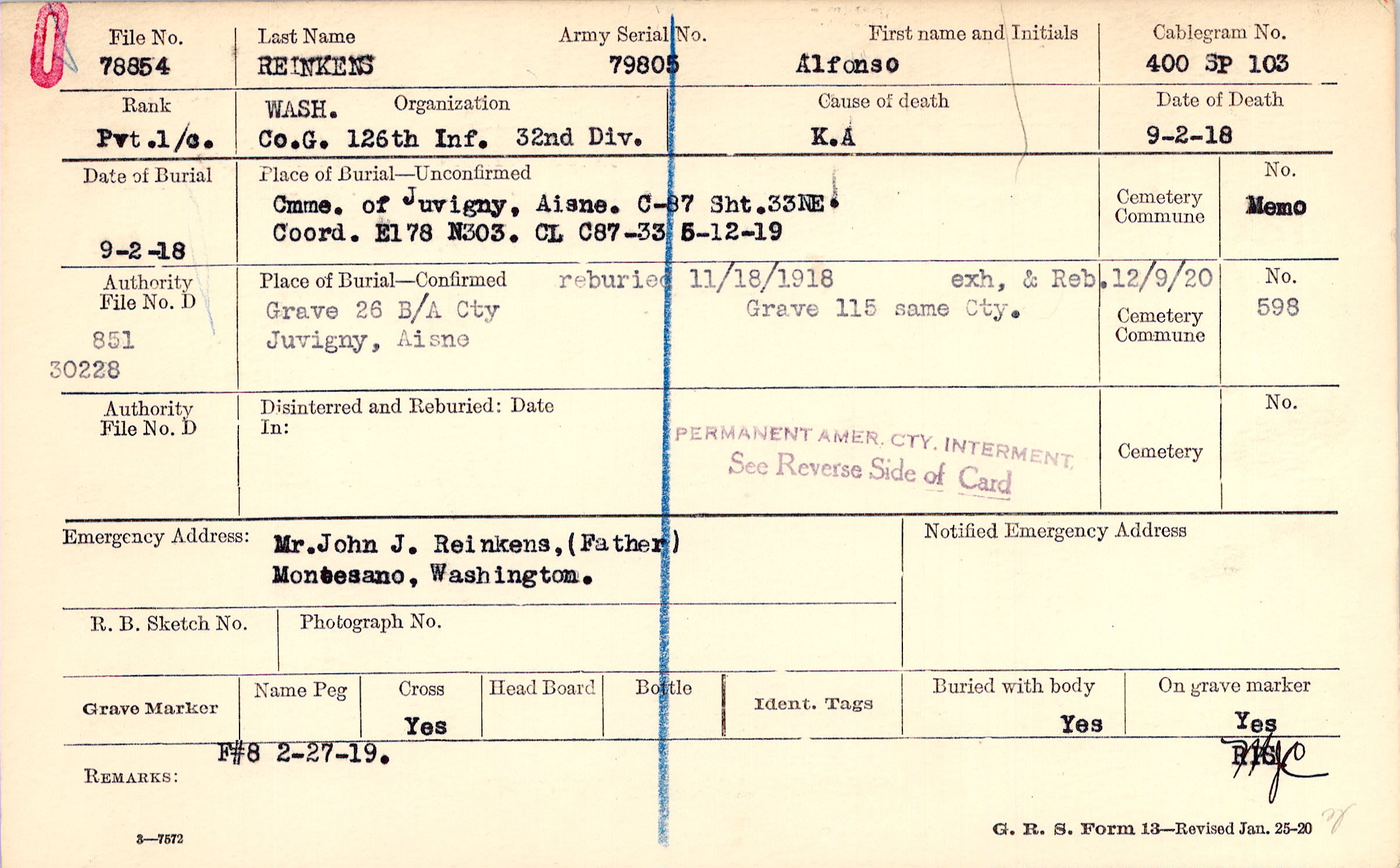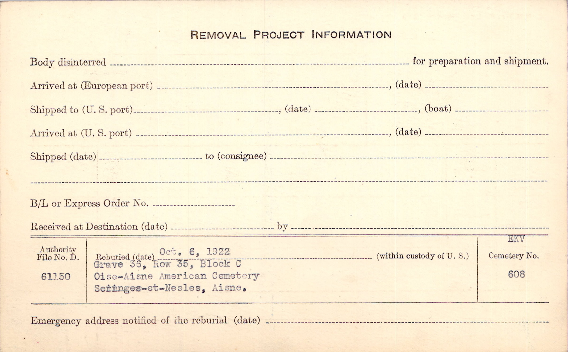 reburied 11/18/1918 exh, & Reb. 12/9/20, Grave 26, B/A Cty., Juvigny, Aisne, Grave 115, same Cty.